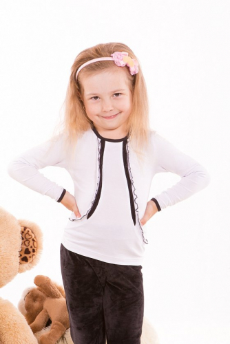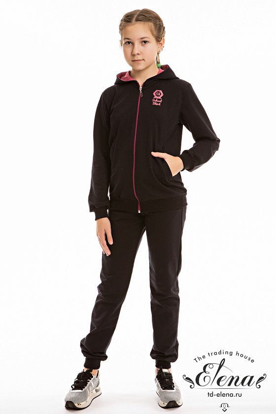 Костюм выполнен из однотонной футер петли с лайкрой. Толстовка с центральной застёжкой на молнию, длинным рукавом на манжете и капюшоном, с двумя карманами спереди и термопринтом. Брюки с поясом на резине и манжетах по низу, по бокам размещены карманы.