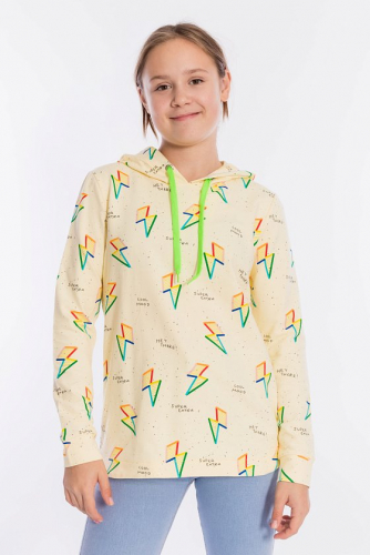 Костюм выполнен из однотонной кулирки с лайкрой, состоит из футболки и брюк. Футболка свободного силуэта, со спущенной линией плеча. Пояс и низ брюк на резине.