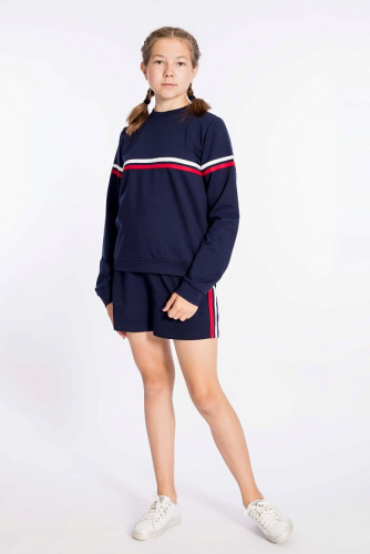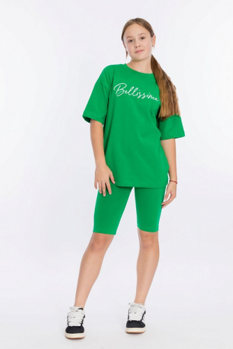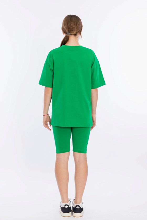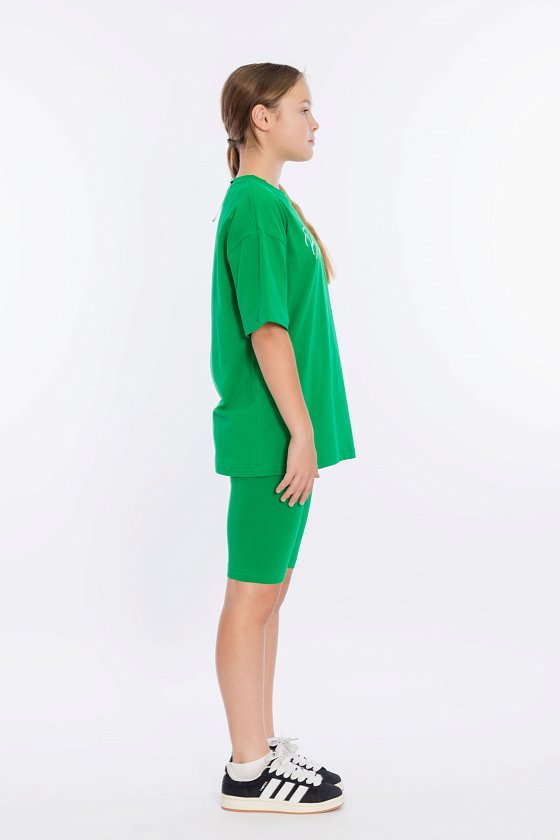 Костюм выполнен из однотонной кулирки с лайкрой, состоит из футболки свободного силуэта и велосипедок. Футболка с коротким втачным рукавом и принтом спереди. Велосипедки с притачным поясом на резине.