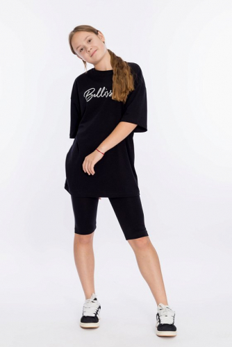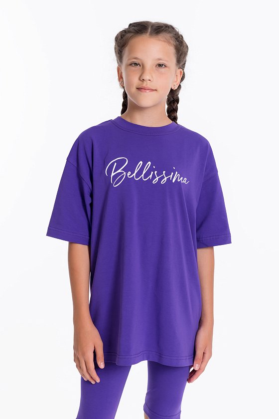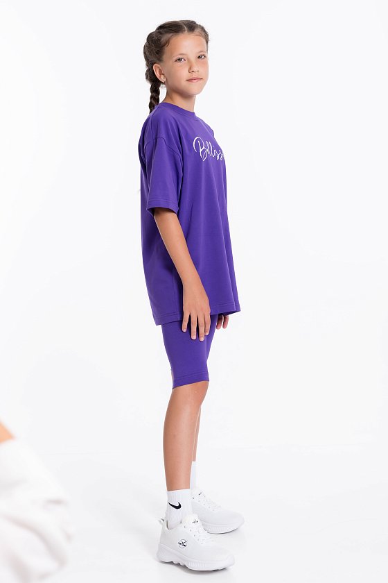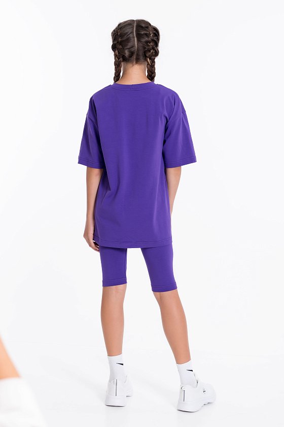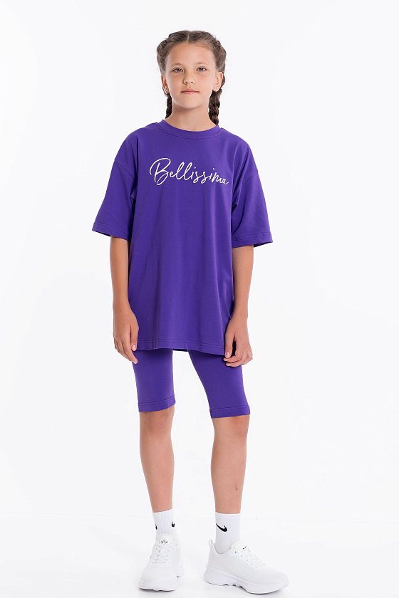 Костюм выполнен из однотонной кулирки с лайкрой, состоит из футболки свободного силуэта и велосипедок. Футболка с коротким втачным рукавом и принтом спереди. Велосипедки с притачным поясом на резине.