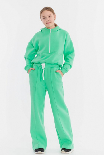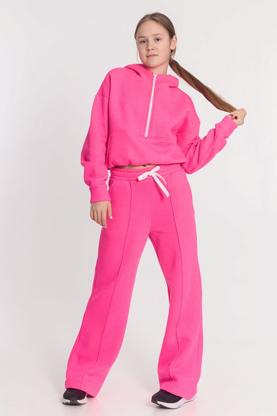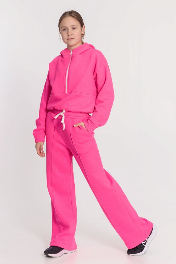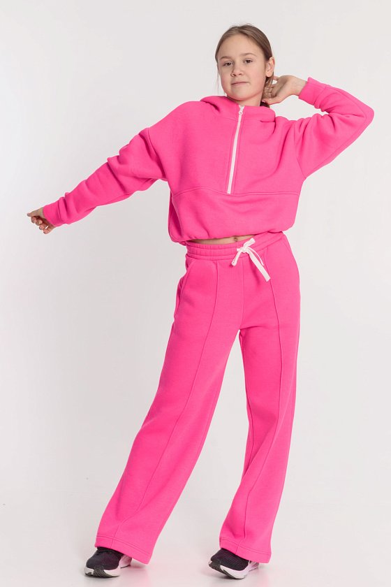 Костюм выполнен из однотонного полотна с начёсом, состоит из свободных, широких брюк и укороченной толстовки. Толстовка с капюшоном и короткой застёжкой на молнии. Линия плеча спущенная, низ толстовки на резинке. Брюки с боковыми карманами и притачным поясом на резине и шнуре, спереди отстрочены стрелки.