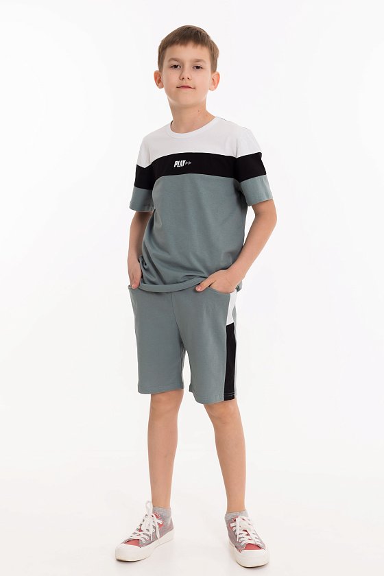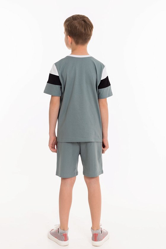 Костюм для мальчика выполнен из кулирки, состоит из футболки и шорт. Футболка с круглым вырезом горловины и принтом спереди. Шорты с поясом на резинке.