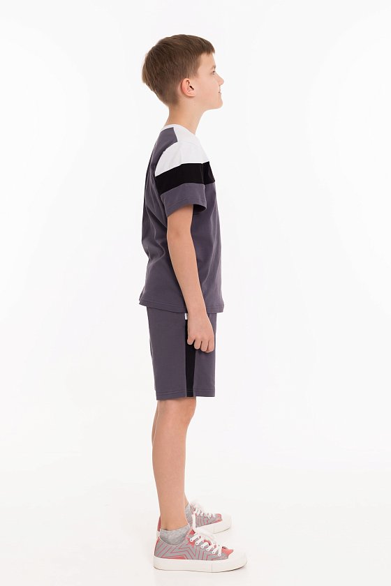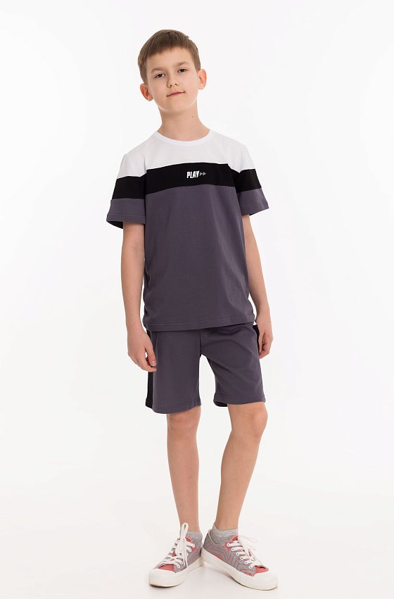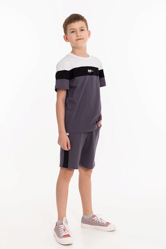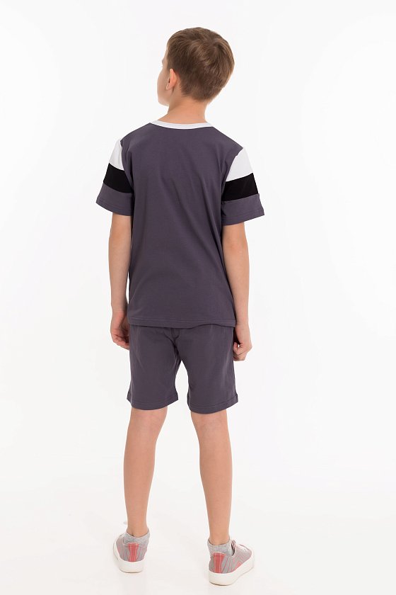 Костюм для мальчика выполнен из кулирки, состоит из футболки и шорт. Футболка с круглым вырезом горловины и принтом спереди. Шорты с поясом на резинке.