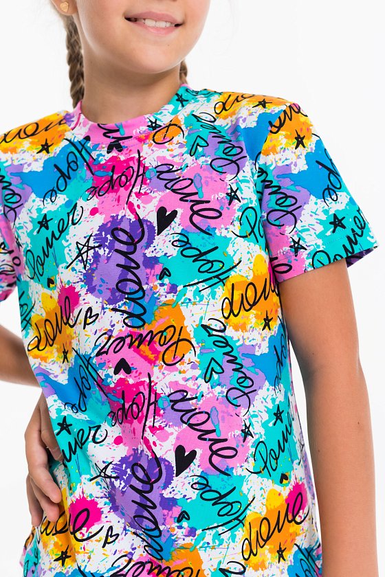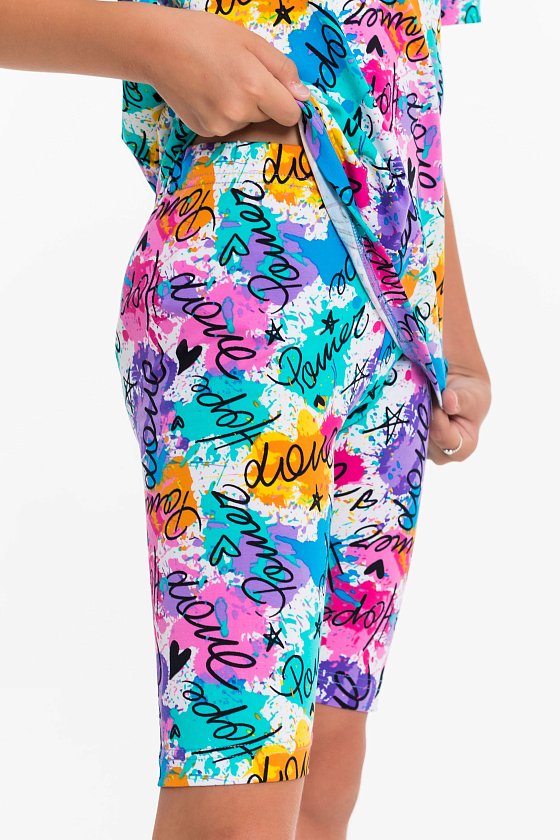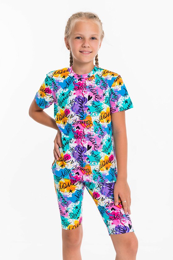 Костюм для девочек из хлопка с добавлением лайкры. Футболка свободная, короткий рукав, круглый вырез горловины. Велосипедки с поясом на резинке.