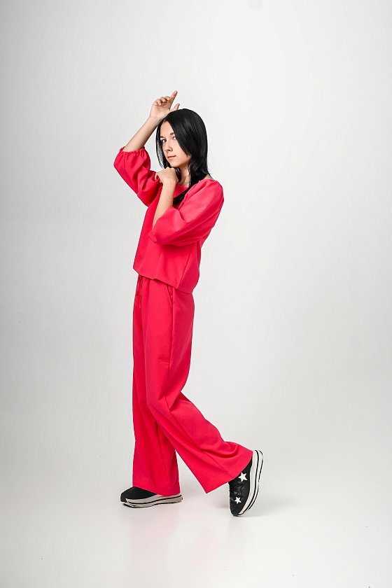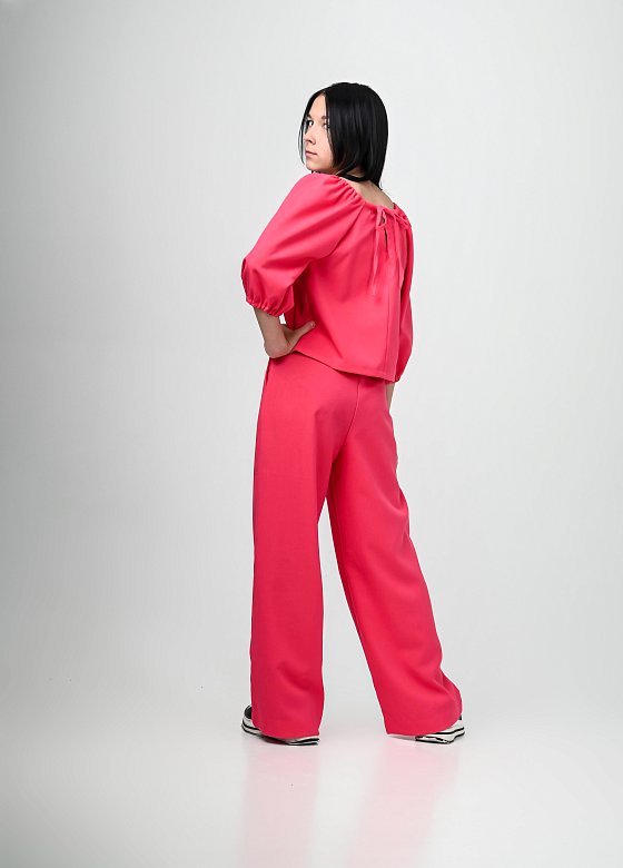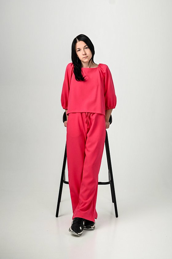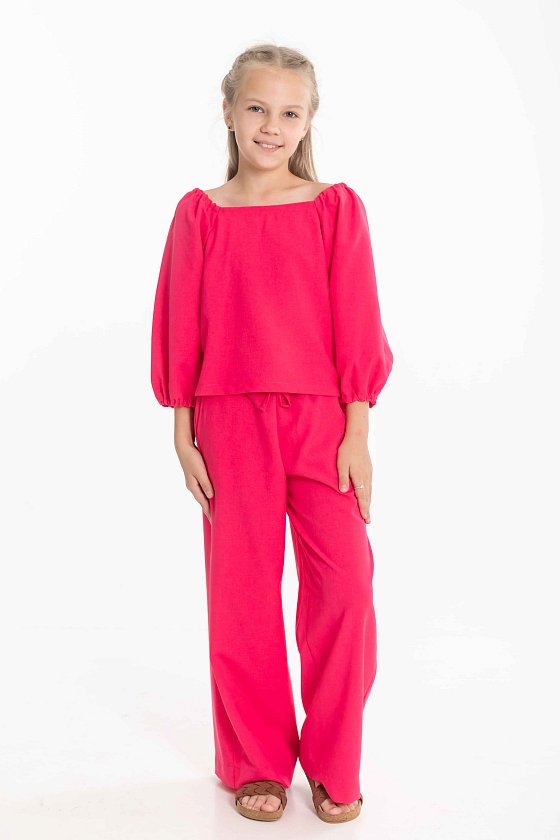 Костюм выполнен из искусственного льна. Стильный комплект состоит из блузки с регулируемыми по длине рукавами на резинке и брюк-палаццо на высокой посадке. Брюки дополнены боковыми карманами и эластичным поясом со шнуром для удобной посадки. Идеальный ансамбль для создания модного и комфортного образа.