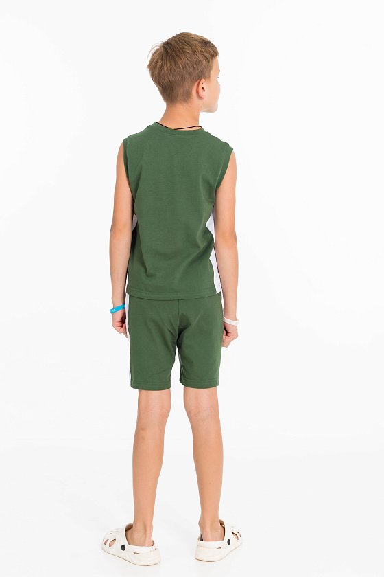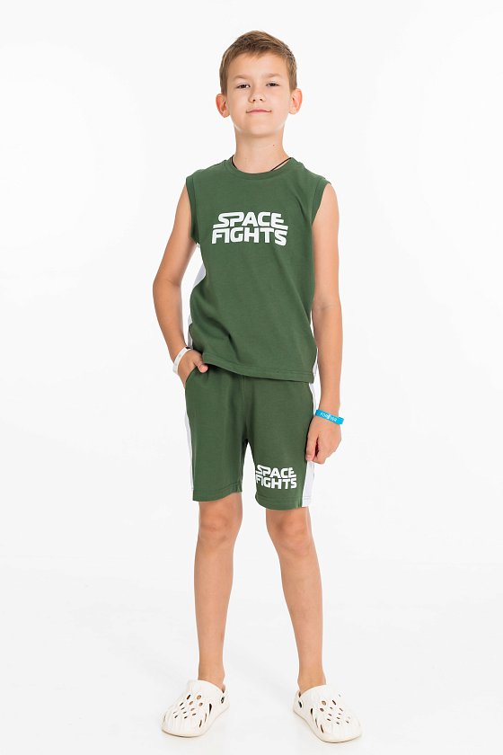 Костюм для мальчика состоит из шорт и майки. Проймы и горловина майки обработаны широкой бейкой. Шорты с поясом на резинке и карманами по бокам. На шортах и майке нанесены принты.
