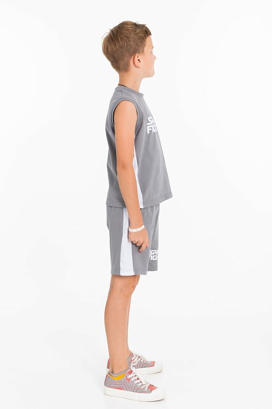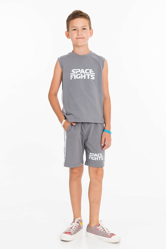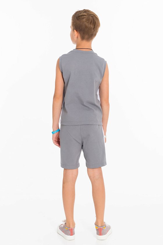 Костюм для мальчика состоит из шорт и майки. Проймы и горловина майки обработаны широкой бейкой. Шорты с поясом на резинке и карманами по бокам. На шортах и майке нанесены принты.