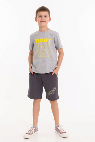 Костюм состоит из шорт и футболки. Футболка из однотонной кулирки, свободного покроя, с рукавами реглан. Шорты из однотонного футера,  с притачным поясом со шнуром и боковыми карманами. На футболке и шортах нанесён принт.