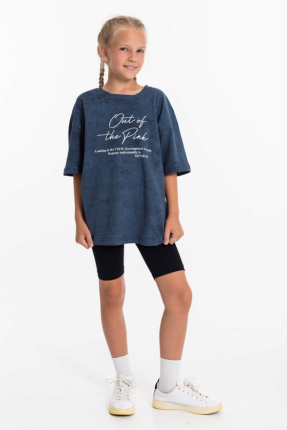 Костюм выполнен из однотонного хлопкового полотна, состоит из футболки свободного силуэта и велосипедок. Футболка с коротким втачным рукавом и принтом спереди. Велосипедки с притачным поясом на резине.