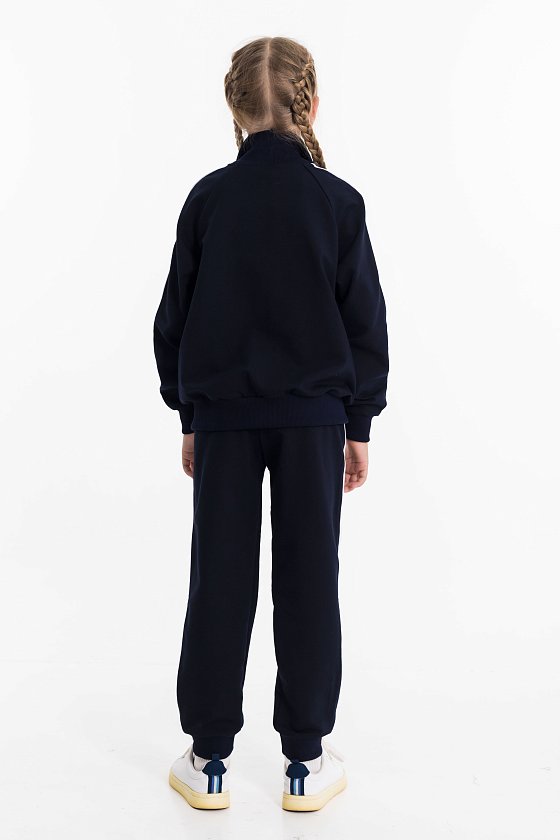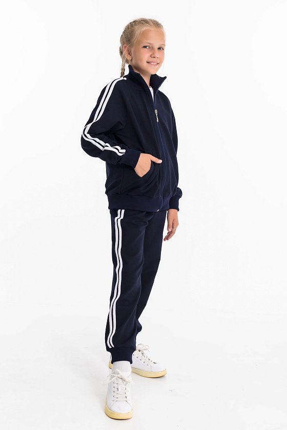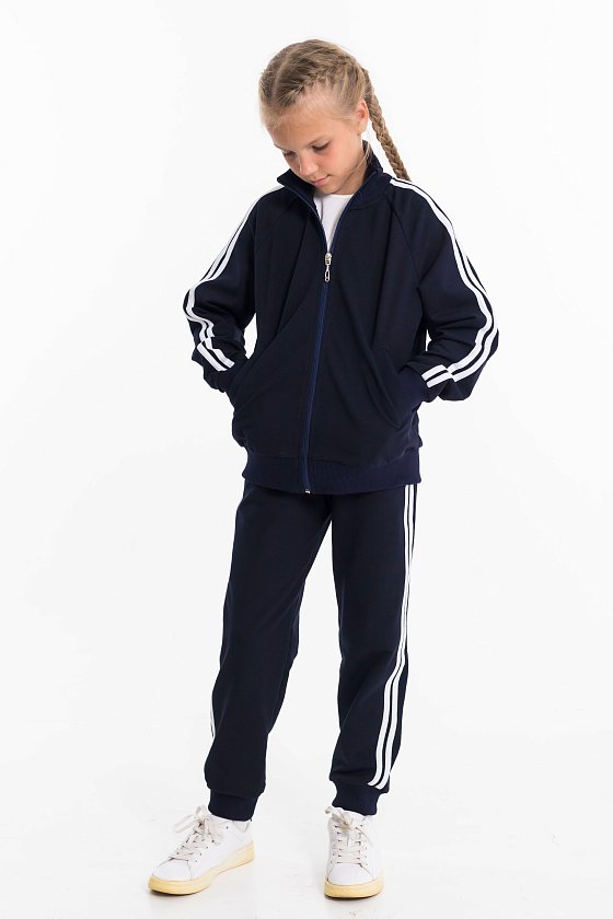 Детский костюм выполнен из однотонного футера с лайкрой, состоит из брюк и толстовки. Брюки с боковыми карманами, притачным поясом и манжетами. В поясе вставлен шнур. Толстовка с застежкой на молнию. С воротником, манжетами и поясом из кашкорсе. По бокам размещены карманы. В качестве отделки по боковым швам брюк и верхнему шву рукавов реглан на толстовке проходят лампасы.