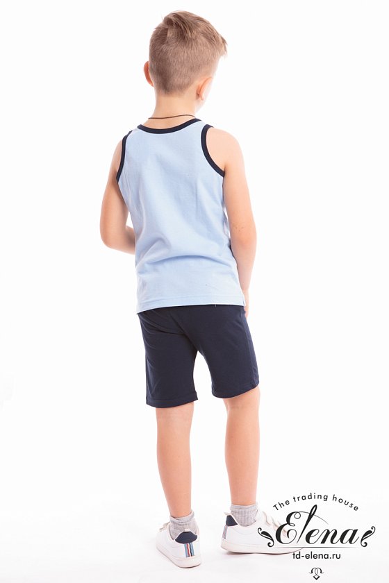 Летний костюм на мальчика (майка+шорты) выполнен из лёгкой хлопковой ткани двух контрастных расцветок. Майка на тонких лямках, круглый вырез горловины и проймы отделаны бейкой. Спереди нанесён принт. Шорты свободного кроя, однотонные, средней длины, пояс под резинку.