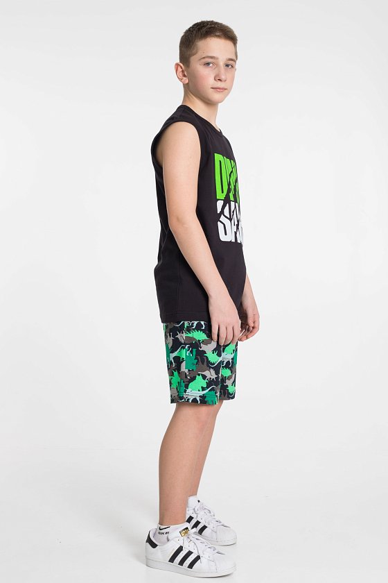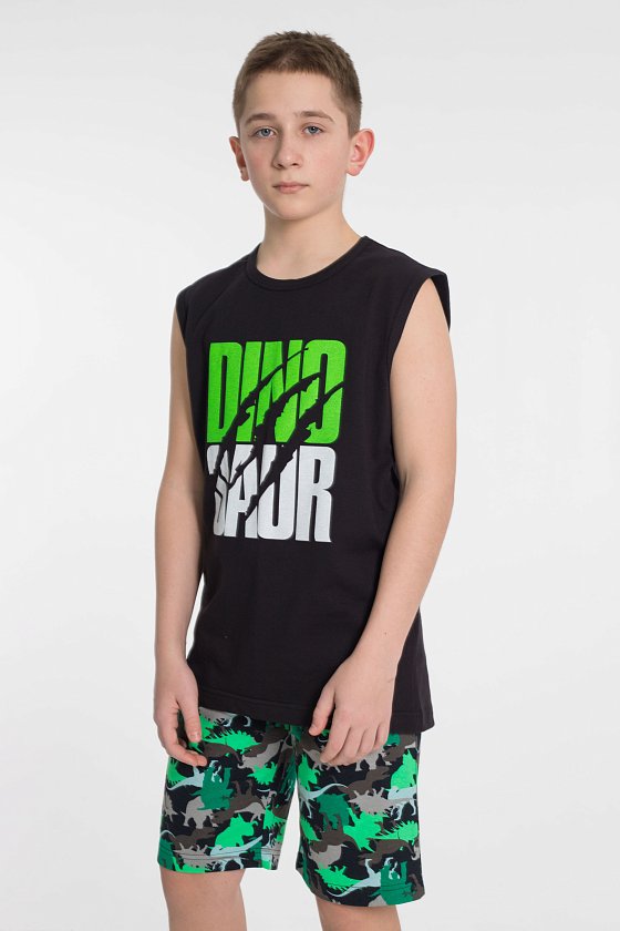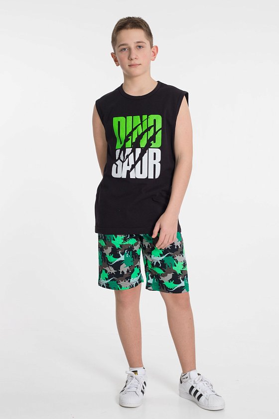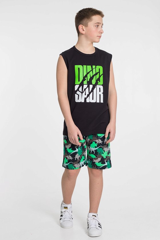 Костюм для мальчика состоит из шорт и майки. Майка из однотонной кулирки, проймы и горловина обработаны широкой бейкой. На майке нанесён принт. Шорты выполнены из кулирки с набивным рисунком. Пояс на резинке.