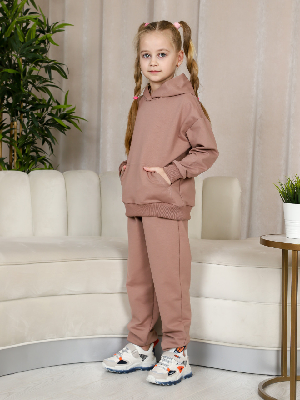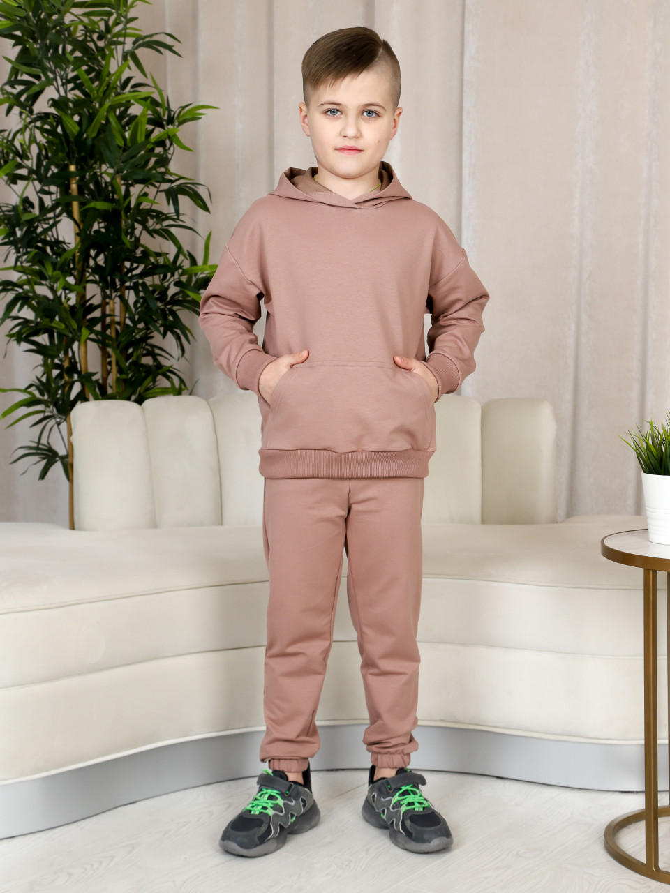 Толстовка свободная с капюшоном и карманом "кенгуру". Брюки прямого кроя снизу на резинке. Удобную посадку брюк обеспечивает поясная резинка. Такой костюм прекрасно подойдёт как для спорта, так и для отдыха.