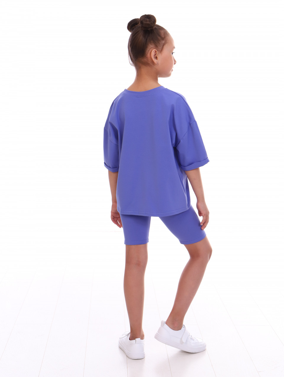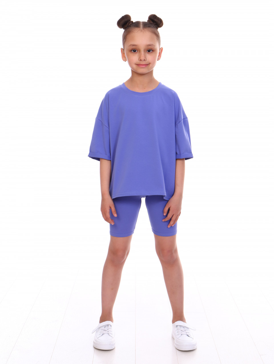 Летний костюм для девочки футболка и лосины, выполнен из кулирки с лайкрой. Футболка прямого кроя с коротким спущенным рукавом, горловина округлая, стиль "оверсайз". Детские велосипедки из эластичной кулирки, по талии на резинке, облегают фигуру не сковывая движений. Спортивный костюм подойдет не только для физических упражнений, но и для дома, отдыха, прогулок.
