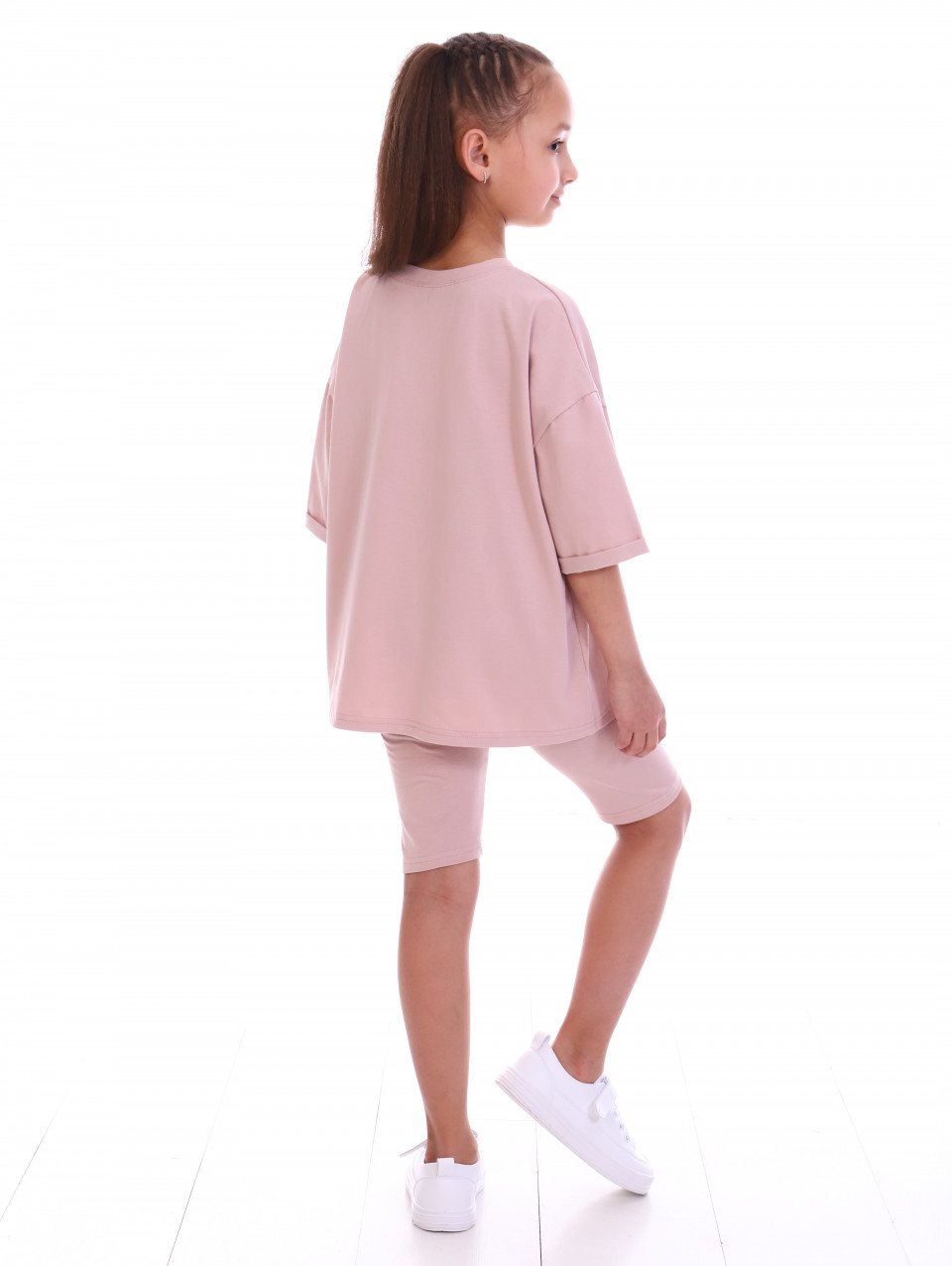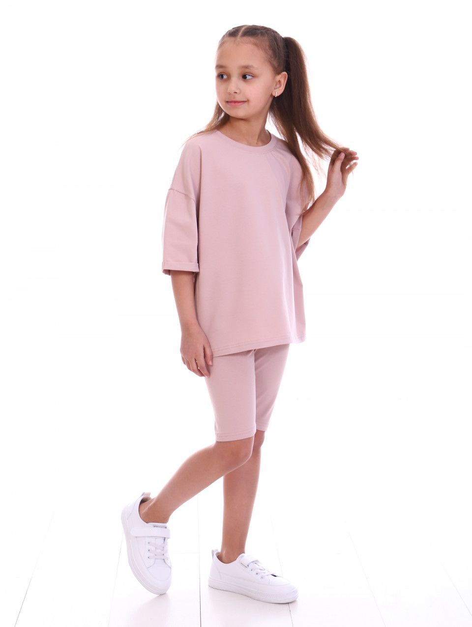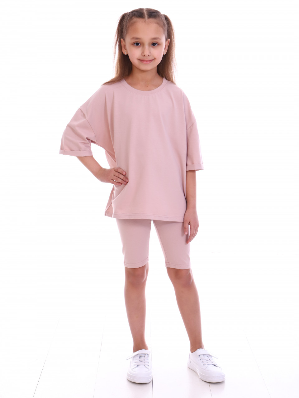 Летний костюм для девочки футболка и лосины, выполнен из кулирки с лайкрой. Футболка прямого кроя с коротким спущенным рукавом, горловина округлая, стиль "оверсайз". Детские велосипедки из эластичной кулирки, по талии на резинке, облегают фигуру не сковывая движений. Спортивный костюм подойдет не только для физических упражнений, но и для дома, отдыха, прогулок.