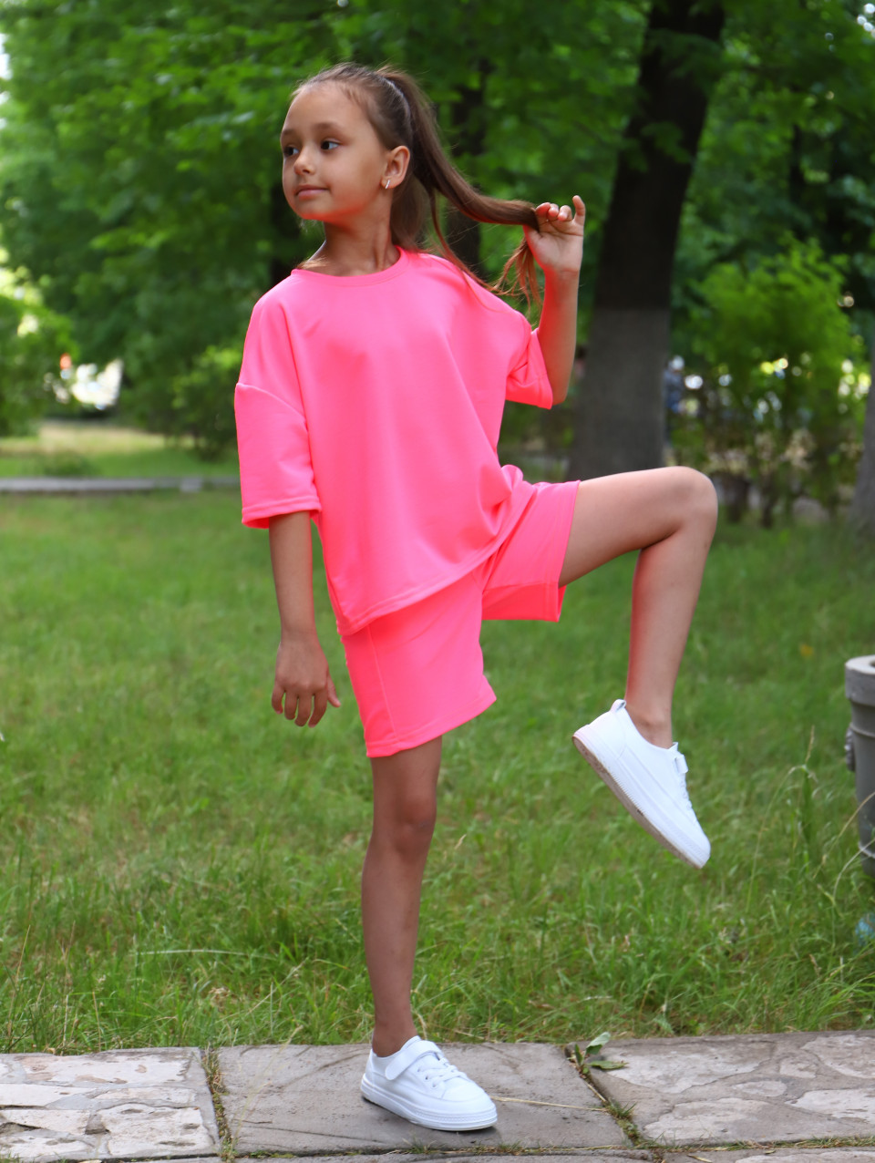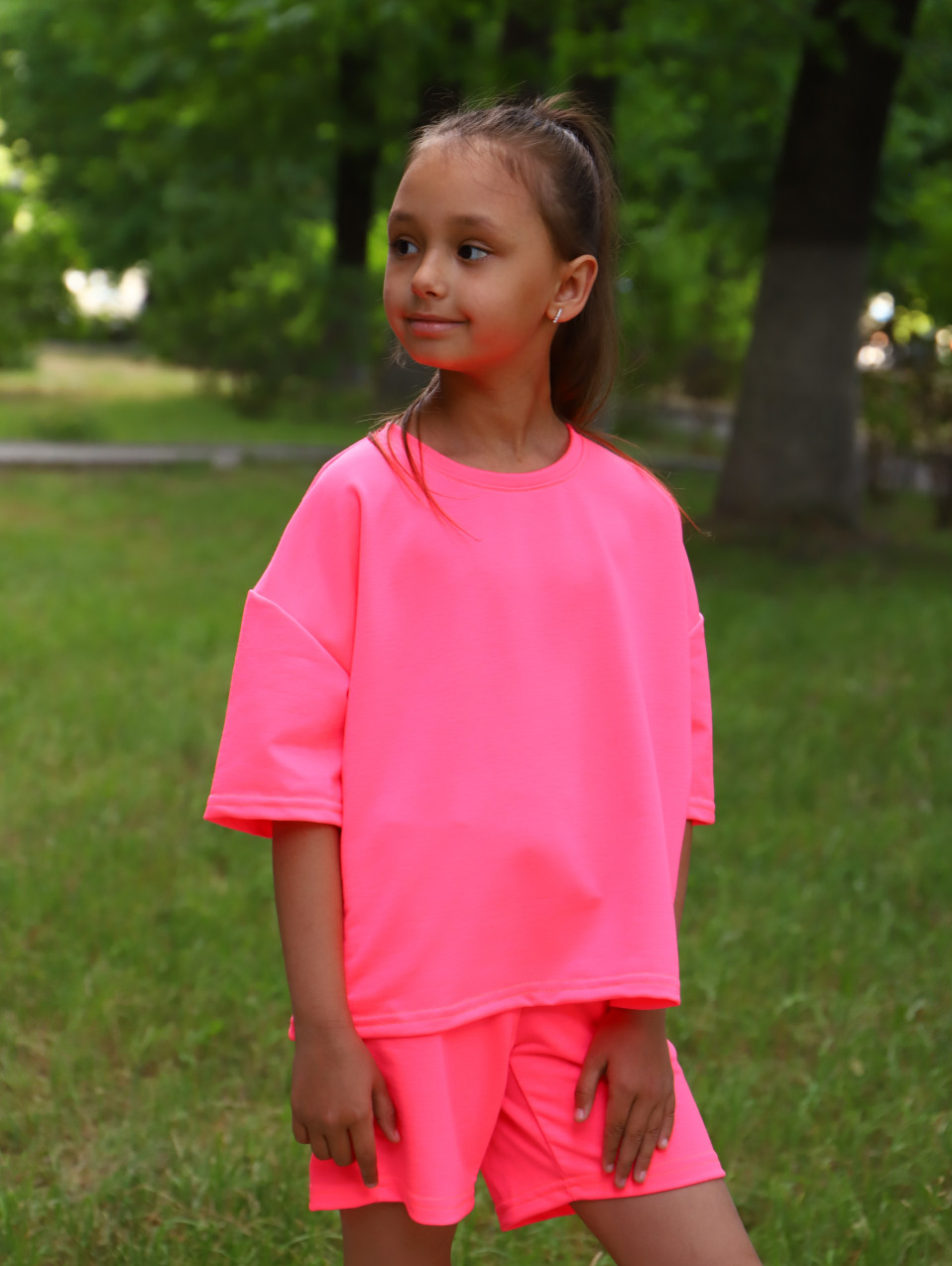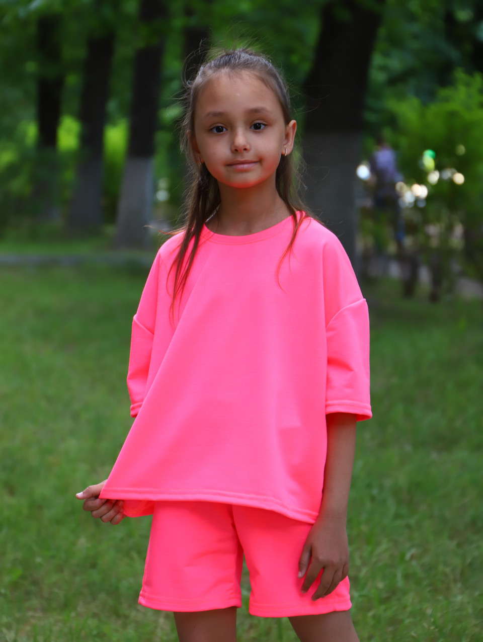 Детский костюм в стиле оверсайз. Стильный, комфортный комплект состоит из футболки и шорт, комплект выполнен из облегченного футера двухнитки высокого качества.  Футболка со спущенным рукавом длиной до линии бедер. Шорты свободного кроя с боковыми карманами. Отличный вариат для летней жаркой погода. Подойдет для дома, отдыха, спорта, прогулок.