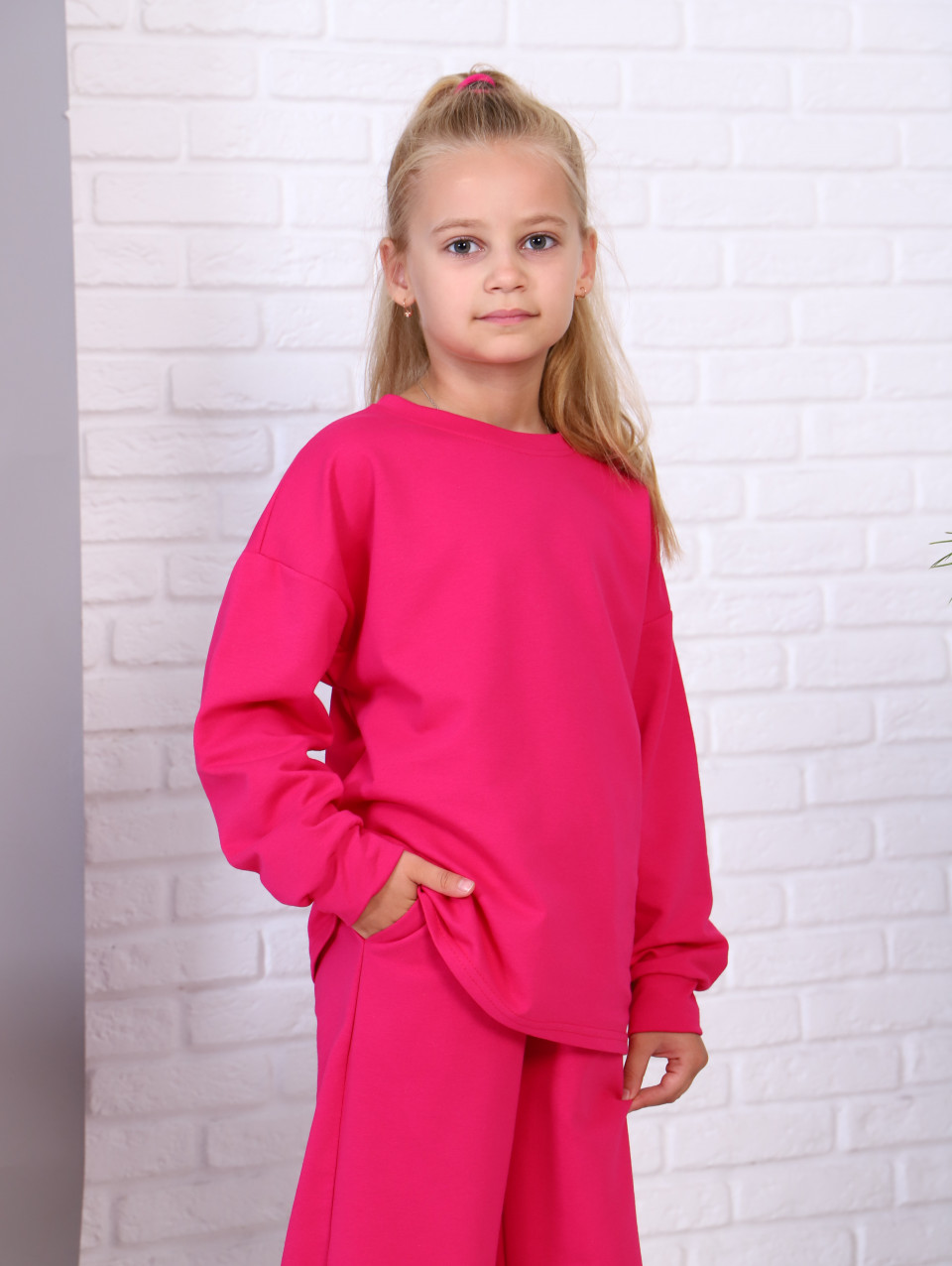 Детский однотонный  костюм для девочки из петельчатого футера. Подростковая толстовка со спущенной линией плеча, рукав длинный с манжетами, горловина кофты округлая. Удлиненные кюлоты имеют два кармана в боковых швах, брюки-трубы на резинке. Спортивный костюм прекрасно подойдет для прогулок, отдыха и дома, а также в качестве подарка.