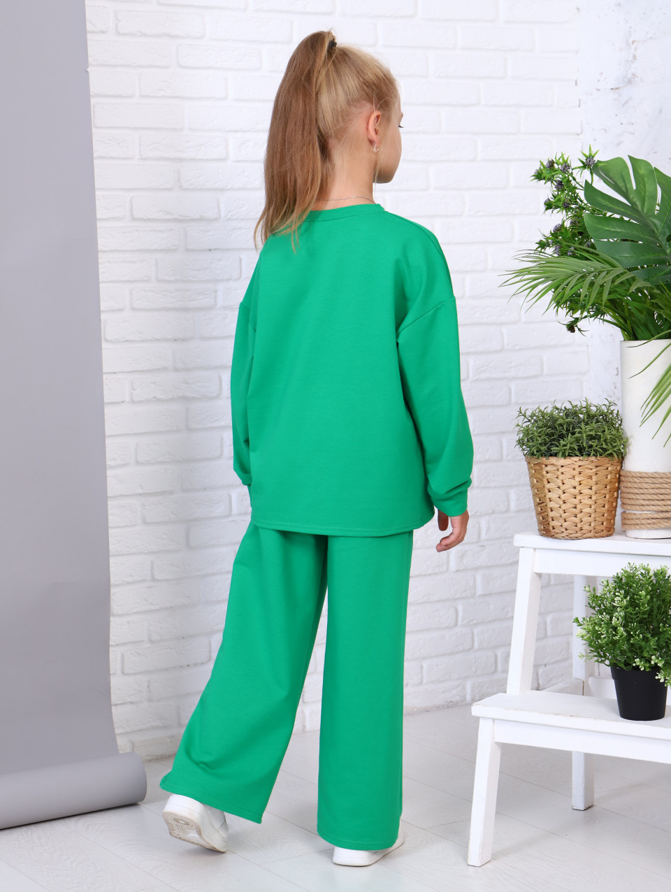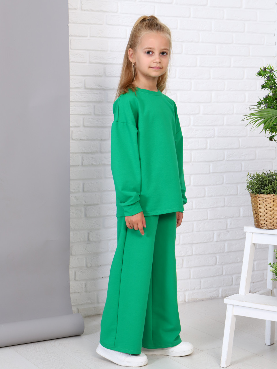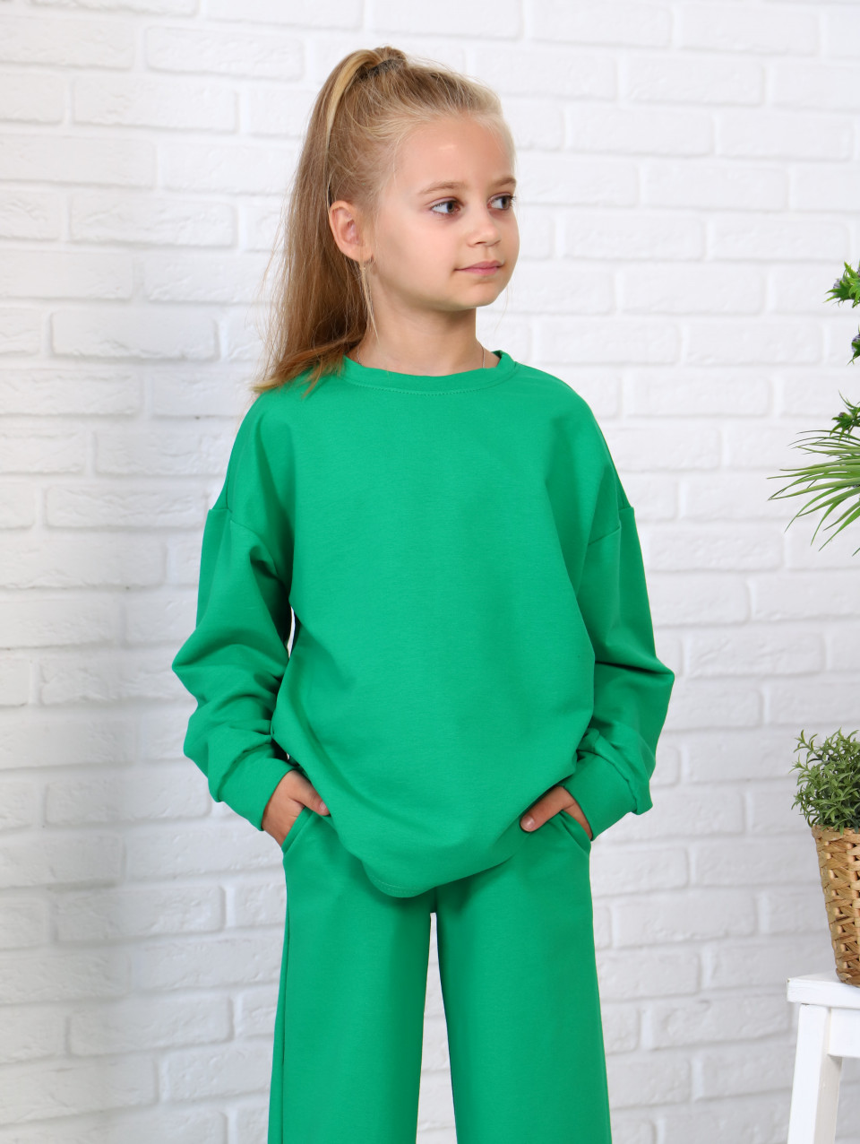 Детский однотонный  костюм для девочки из петельчатого футера. Подростковая толстовка со спущенной линией плеча, рукав длинный с манжетами, горловина кофты округлая. Удлиненные кюлоты имеют два кармана в боковых швах, брюки-трубы на резинке. Спортивный костюм прекрасно подойдет для прогулок, отдыха и дома, а также в качестве подарка.