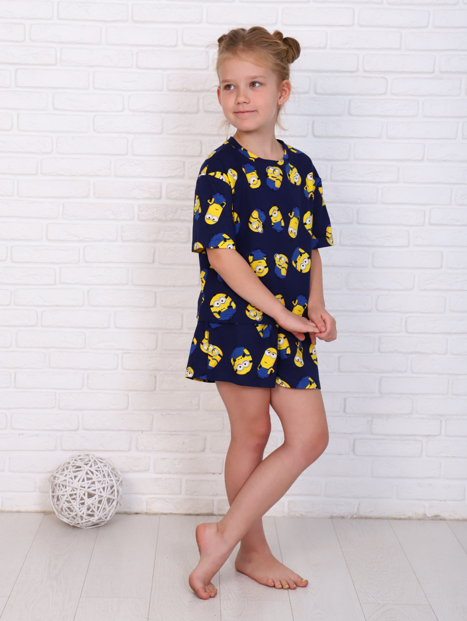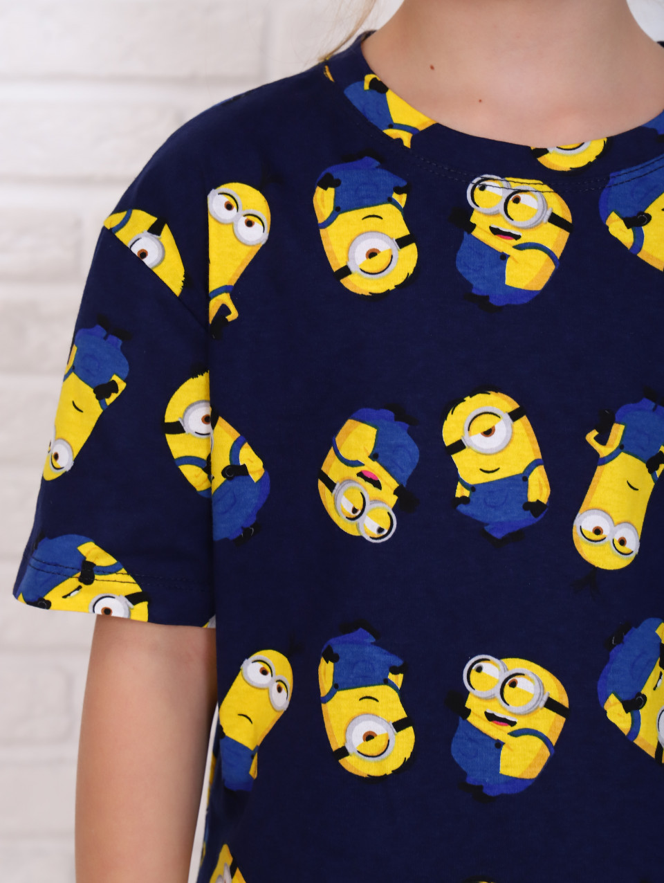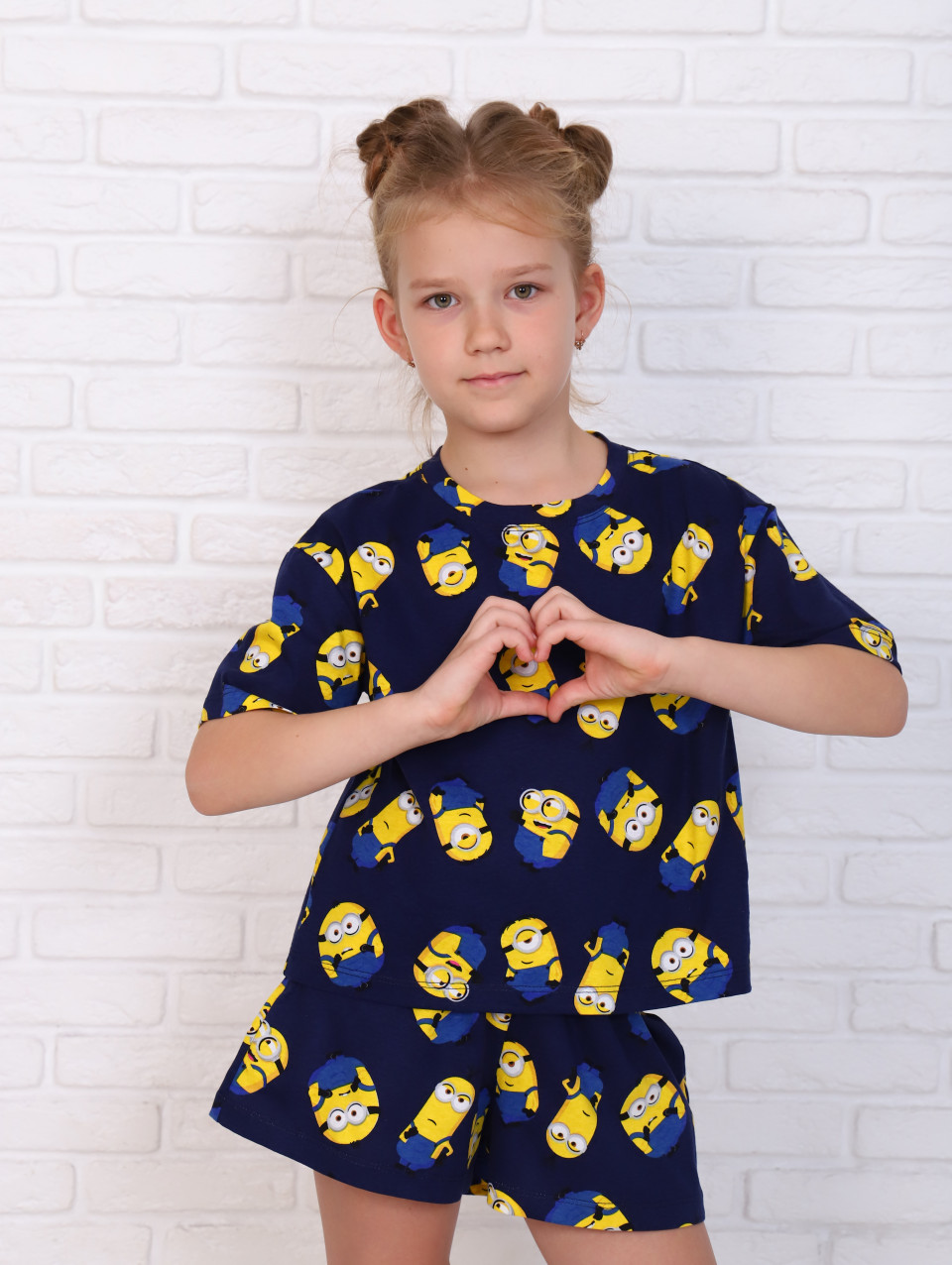Детский костюм оверсайз с любимыми миньонами. Футболка со спущенным рукавом, свободного покроя. Широкие подростковые шорты на резинке. Домашний комплект для девочки подойдет в качестве пижамы.