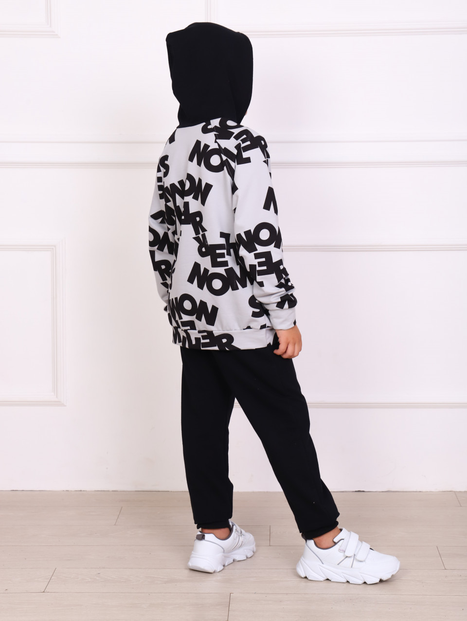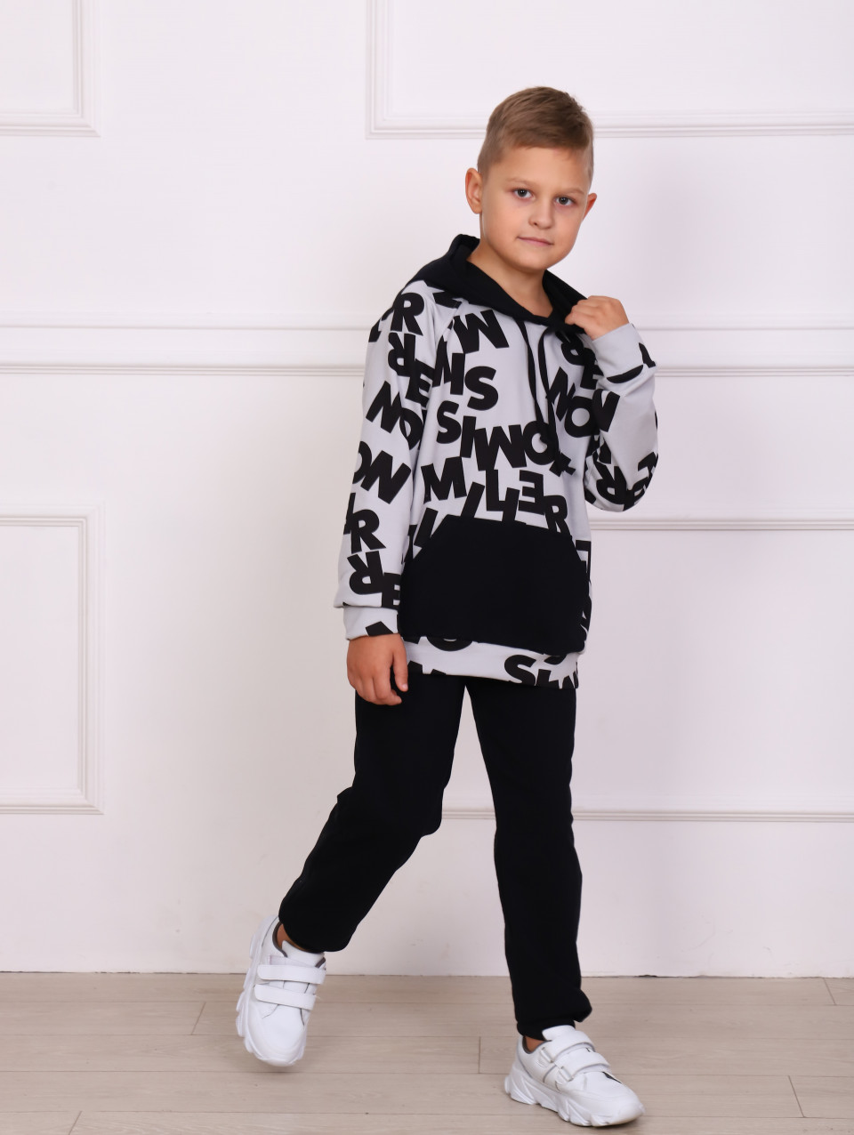 Детский костюм с капюшоном для активного отдыха. Брюки однотонные с манжетом, в боковых швах два удобных кармана. Толстовка комбинированная, рукав реглан, на полочке карман-кенгуру. В капюшоне есть два утягивающих шнурка для защиты от ветра.