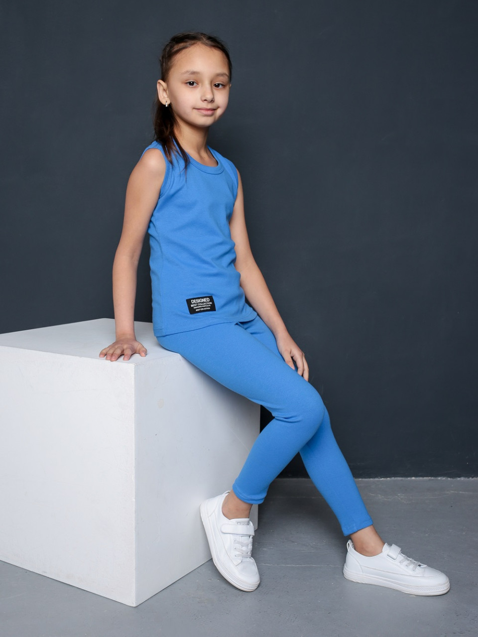 Летний спортивный костюм для девочки. Майка приталенного силуэта без рукавов, брючки обтягивающие. Детский комплект отлично подойдет для отдыха, дома, прогулок.