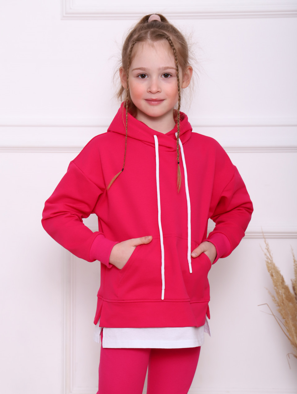 Костюм спортивный для девочки и для девочек подростков с принтом. Комплект представляет собой брюки и свитшот с капюшоном. Спортивные штаны джоггеры без карманов. Брючки на мягкой широкой эластичной резинке, которая не передавливает кожу, подстраивается под положение тела ребенка и его движения, обеспечивая комфорт на целый день. Толстовка с длинными рукавами и с карманом кенгуру с надписью на спине. Повседневный костюм детский изготовлен и из натурального гипоаллергенного 80% хлопка, хб с добавлением 20% полиэстера для сохранения формы изделия после стирки и во время носки.
