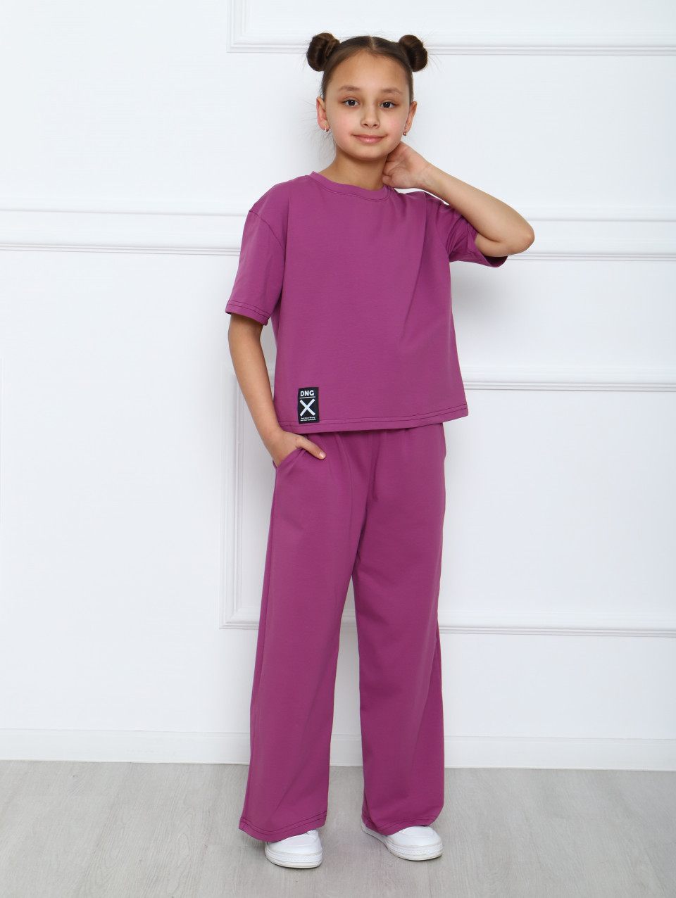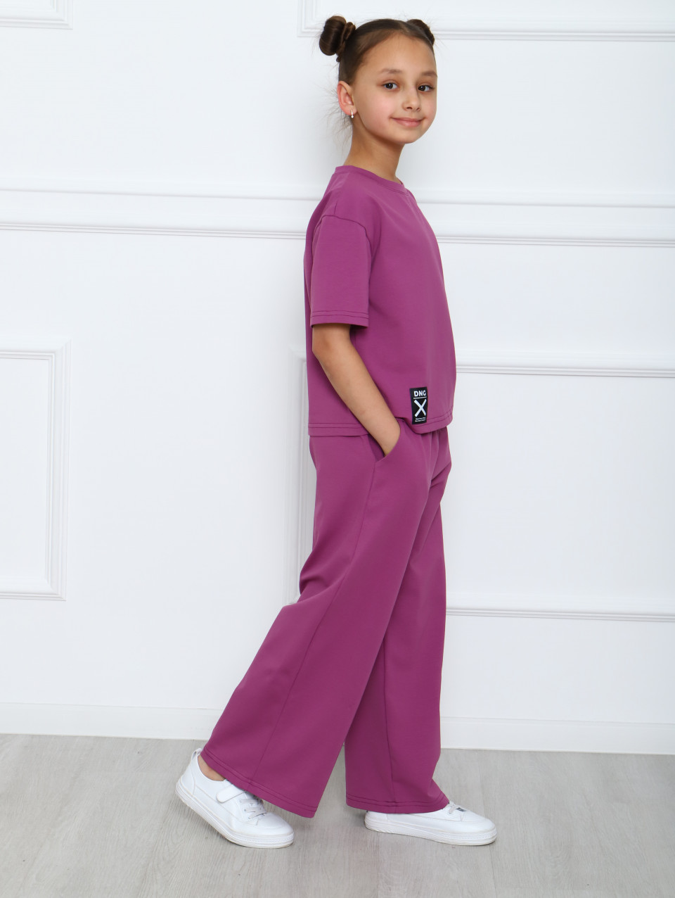 Спортивный костюм для девочки и для девочек подростков с брюками. Комплект представляет собой брюки и футболку. Брюки палаццо свободные и широкие, клеш, с карманами. Штаны на мягкой широкой эластичной резинке на поясе, которая не передавливает кожу, подстраивается под ваше положение тела и движения и обеспечивает комфорт на целый день. Футболка прямого кроя с коротким рукавом и округлым вырезом горловины. Костюм детский изготовлен из нежного трикотажного полотна высокого качества из натурального гипоаллергенного 95% хлопка, хб, и 5% лайкра.