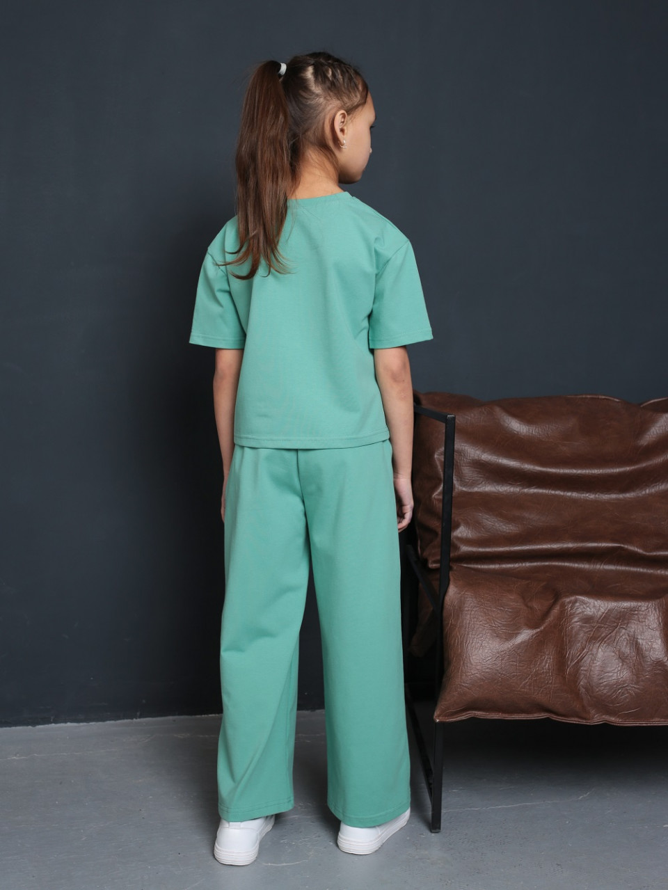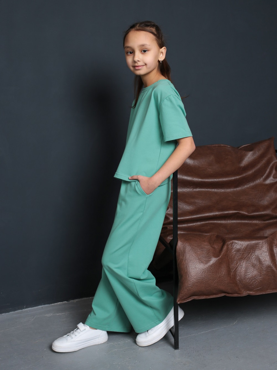 Спортивный костюм для девочки и для девочек подростков с брюками. Комплект представляет собой брюки и футболку. Брюки палаццо свободные и широкие, клеш, с карманами. Штаны на мягкой широкой эластичной резинке на поясе, которая не передавливает кожу, подстраивается под ваше положение тела и движения и обеспечивает комфорт на целый день. Футболка прямого кроя с коротким рукавом и округлым вырезом горловины. Костюм детский изготовлен из нежного трикотажного полотна высокого качества из натурального гипоаллергенного 95% хлопка, хб, и 5% лайкра.