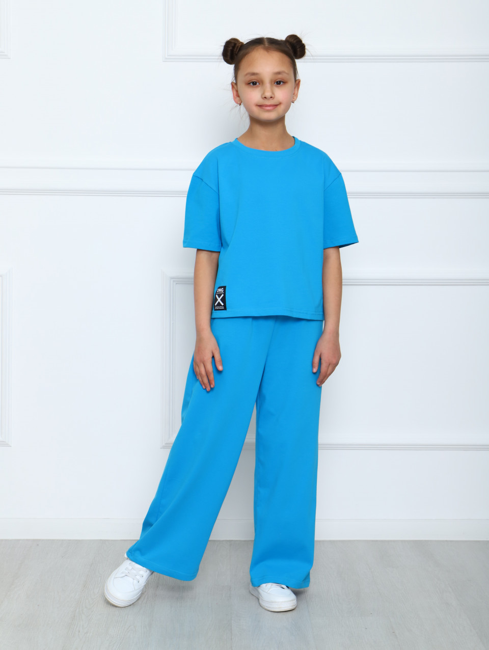 Спортивный костюм для девочки и для девочек подростков с брюками. Комплект представляет собой брюки и футболку. Брюки палаццо свободные и широкие, клеш, с карманами. Штаны на мягкой широкой эластичной резинке на поясе, которая не передавливает кожу, подстраивается под ваше положение тела и движения и обеспечивает комфорт на целый день. Футболка прямого кроя с коротким рукавом и округлым вырезом горловины. Костюм детский изготовлен из нежного трикотажного полотна высокого качества из натурального гипоаллергенного 95% хлопка, хб, и 5% лайкра.