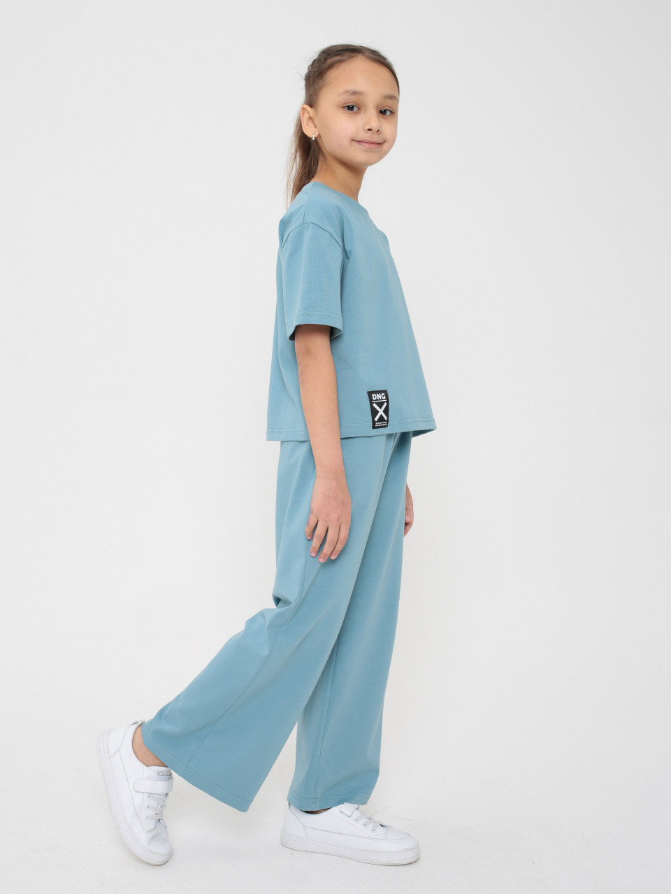Спортивный костюм для девочки и для девочек подростков с брюками. Комплект представляет собой брюки и футболку. Брюки палаццо свободные и широкие, клеш, с карманами. Штаны на мягкой широкой эластичной резинке на поясе, которая не передавливает кожу, подстраивается под ваше положение тела и движения и обеспечивает комфорт на целый день. Футболка прямого кроя с коротким рукавом и округлым вырезом горловины. Костюм детский изготовлен из нежного трикотажного полотна высокого качества из натурального гипоаллергенного 95% хлопка, хб, и 5% лайкра.