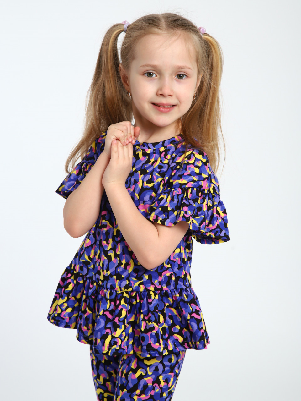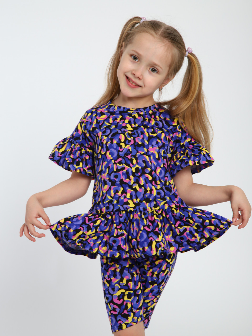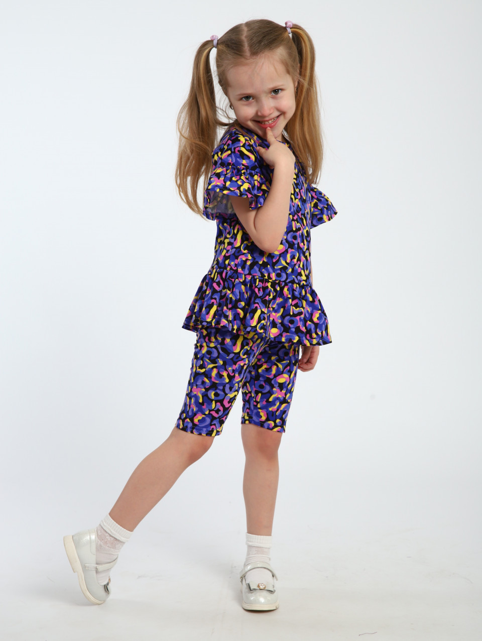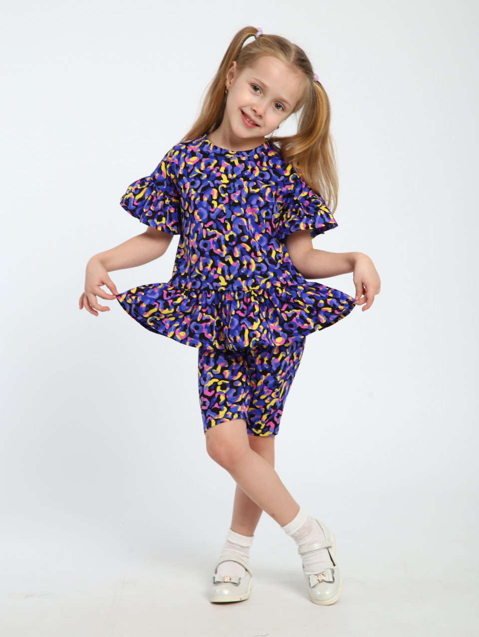 Этот очаровательный хлопковый костюм с лосинами создан специально для маленьких модниц. Включает брюки и кофту с рюшами, обеспечивая комфорт и стиль на каждый день. Выполнен из высококачественного натурального трикотажа – кулирка (100% хлопок), что делает его мягким и приятным к коже ребенка. Этот повседневный комплект с лосинами для девочек станет незаменимой частью гардероба вашей малышки благодаря своей универсальности. Обтягивающие леггинсы подойдут как для осенних прогулок, так и для дома или детского сада. Модная туника с длинным рукавом дополнительно украшена ярким принтом, даря ей яркий и праздничный вид. Трикотажные вещи подходят для всех сезонов, создавая уют в любое время года, даже осенью. Особенно актуален такой наряд на утренники или другие праздничные мероприятия в садике. Брючный фасон с баской добавляет игривости и позволяет носить его даже на танцы или гимнастику. Удобный крой обеспечивает свободу движений, а хлопковый материал не раздражает кожу малыша.
