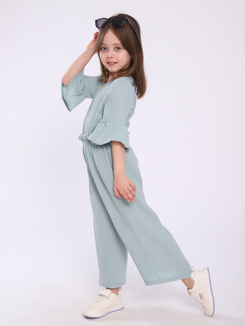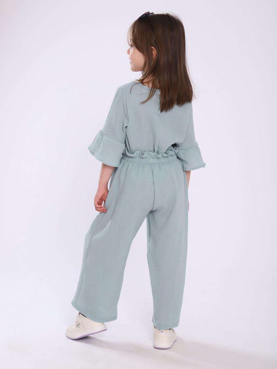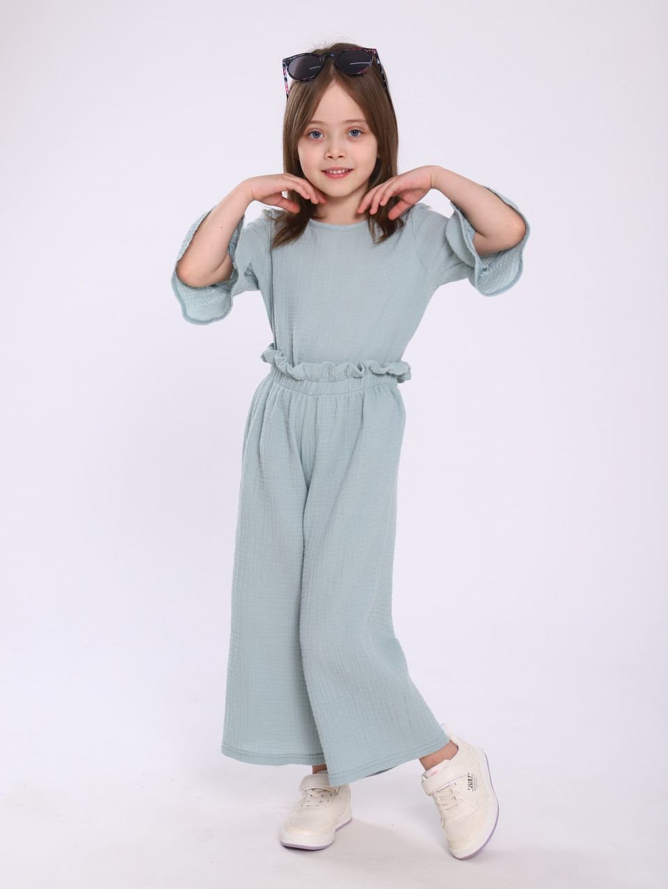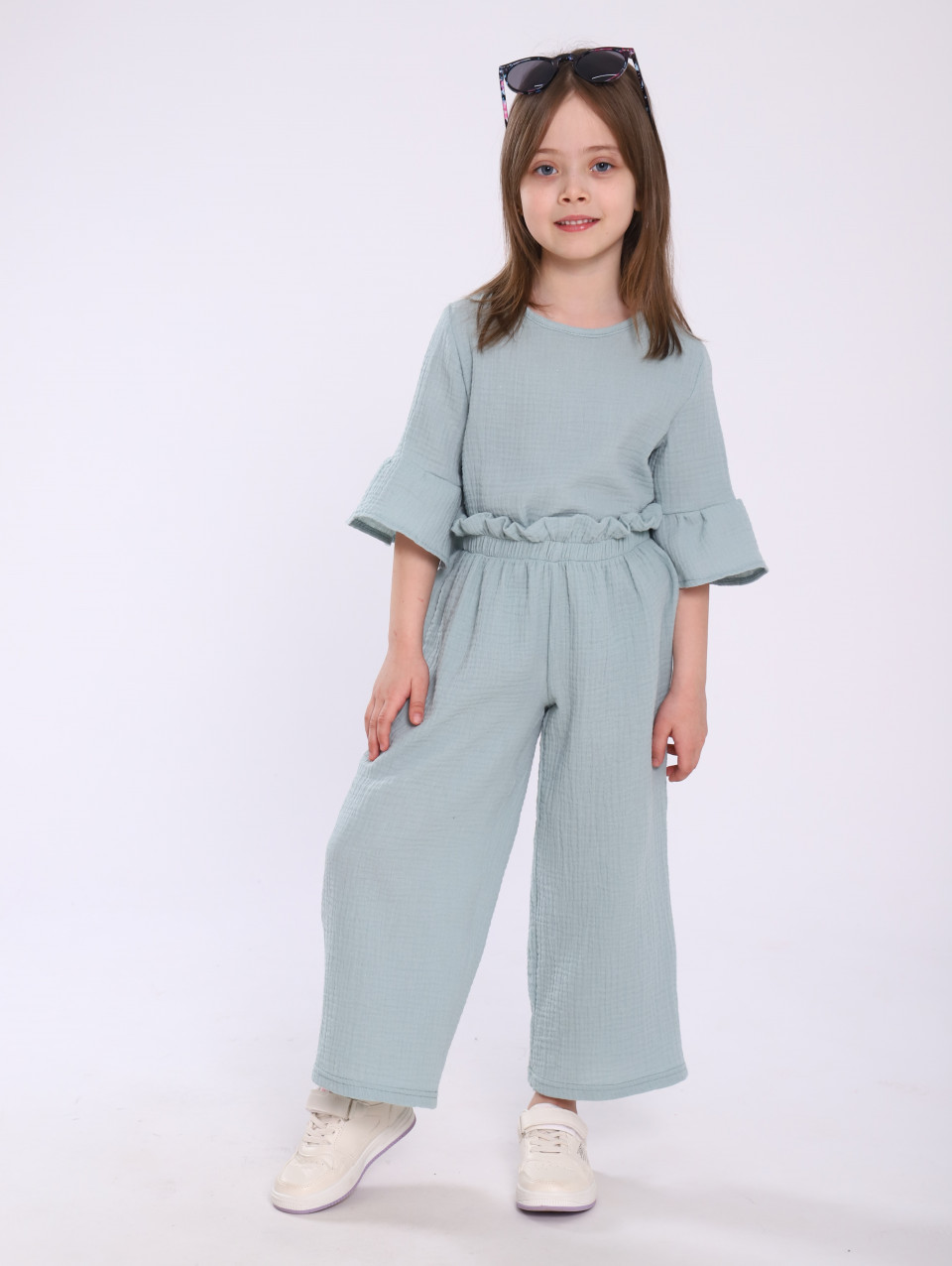 Летний костюм для девочки из муслина. Костюм включает в себя  брюки палаццо и нежную блузку. Это идеальный вариант для летнего сезона. В таком костюме будет комфортно даже в самые жаркие дни. Муслин - это 100% хлопок, считается наилучшей среди тканей для детской одежды. Комплекты для детей из муслина могут использоваться в любое время года, ткань прекрасно впитывает влагу и не ощущается на коже. Кроме того, данная одежда износостойкая, приятная к телу, комфортная и удобная.