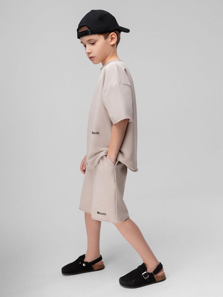 Артикул 11-665MU Состав 92% хлопок 8% лайкра Материал футер двухнитка Костюм: футболка и шорты. Свободная футболка с коротким рукавом. Горловина футболки округлой формы с необработанным краем. Низ изделия и низ рукава не обработаны. Шорты прямые, свободные на поясе с внутренней резинкой, с боковыми карманами. Шорты по низу изделия с необработанным краем.