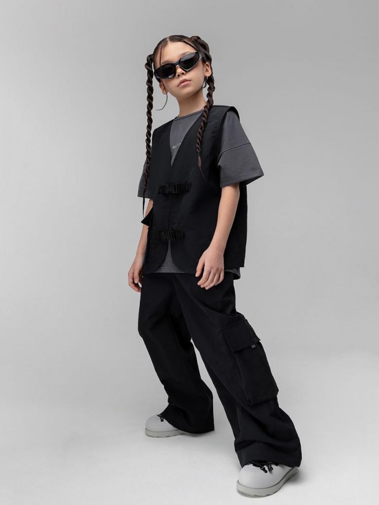 Артикул 32-90MU Состав 100% полиэстер Материал таслан Костюм: жилет и брюки. Жилет без подкладки, прямого силуэта на застёжке фастекс. На полочке располагается накладной карман закрытый клапаном. Свободные, прямые брюки на поясе с внутренней резинкой. Брюки с двумя видами карман, боковые карманы и накладной карман по левому боковому шву закрытый клапаном, по низу брюк имеется дополнительная резинка с фиксатором для затяжки.