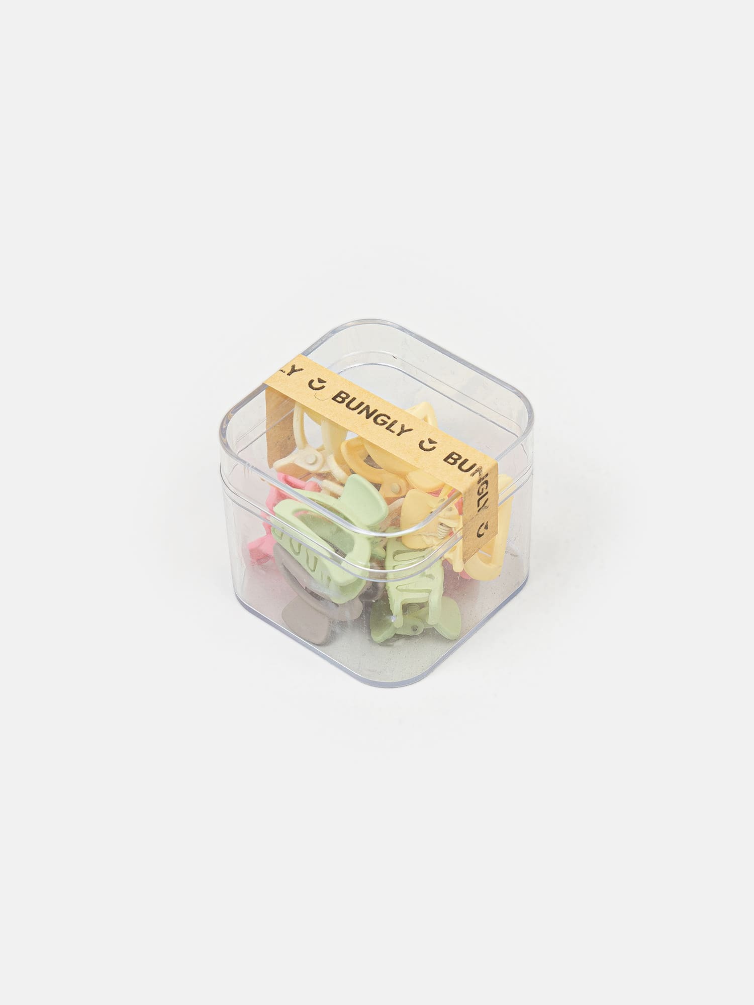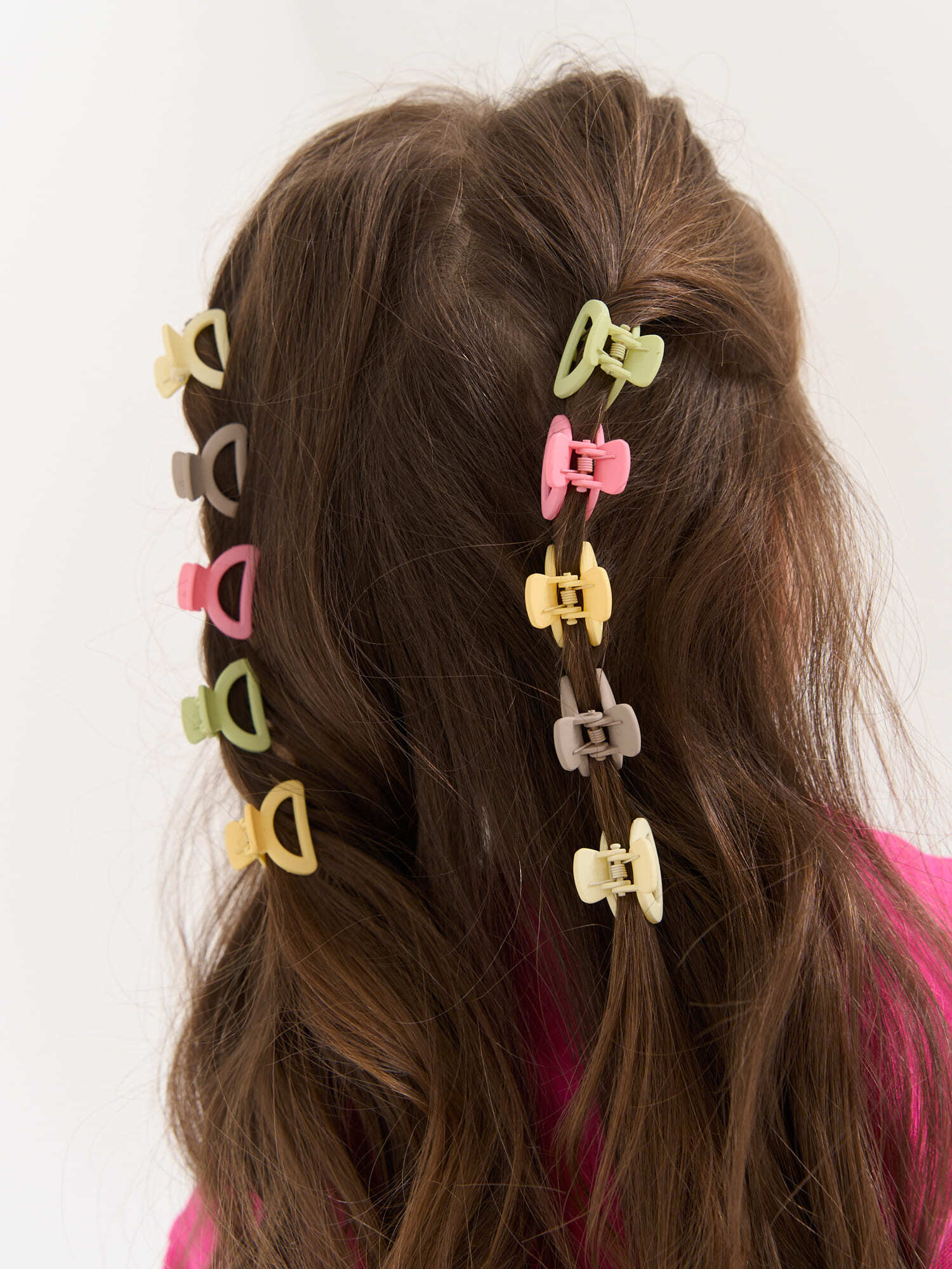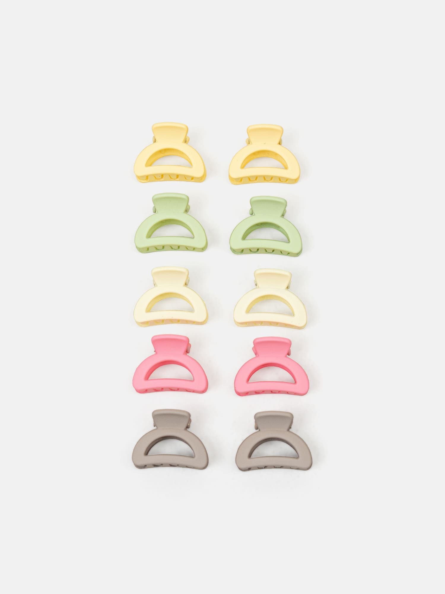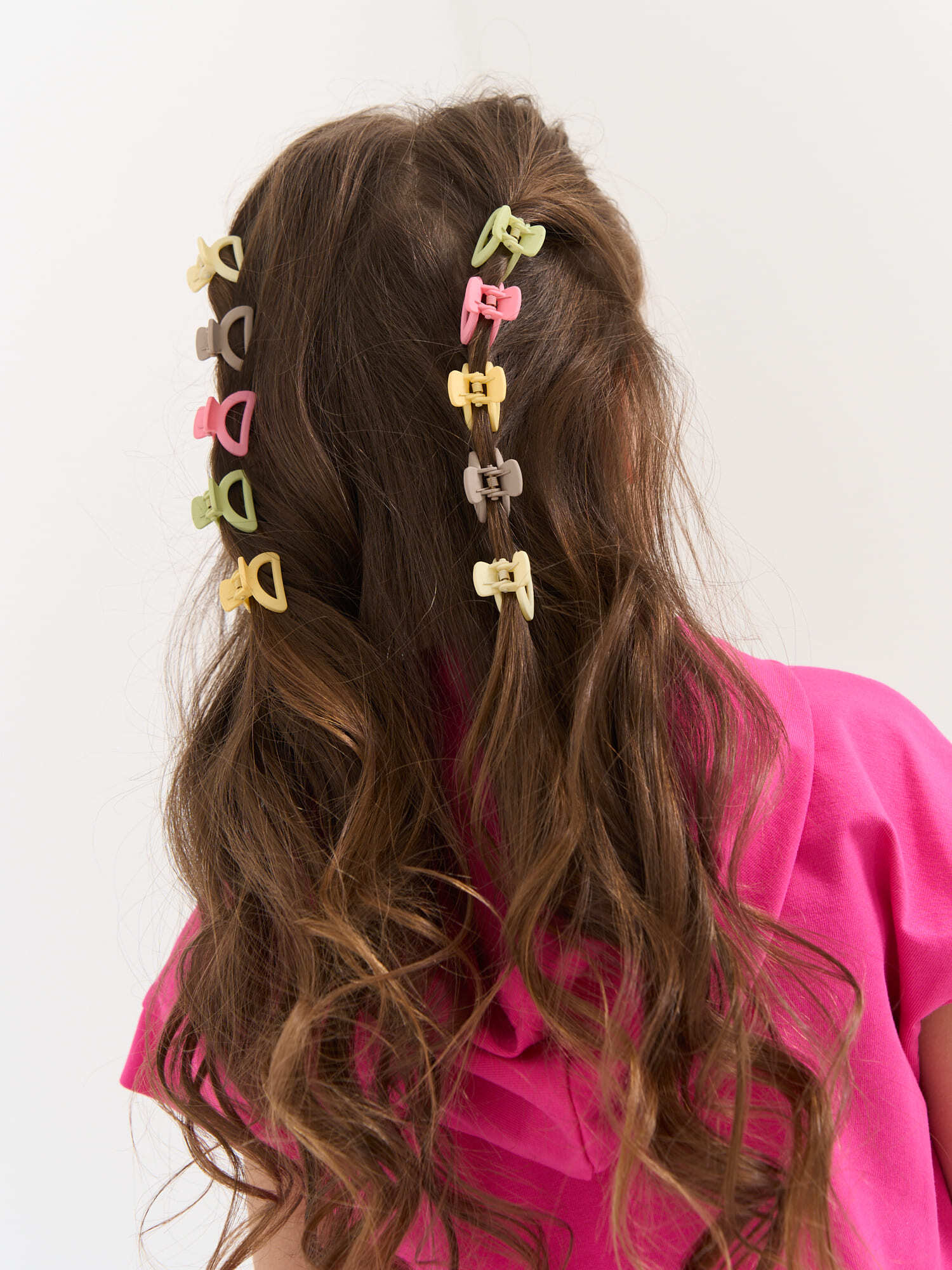 Комплект пластиковых заколок-крабов в количестве 10 штук (по две заколки каждого цвета). Комплект дополнен пластиковой коробкой для хранения. Крабики хорошо держат волосы и имеют приятное матовое покрытие.
