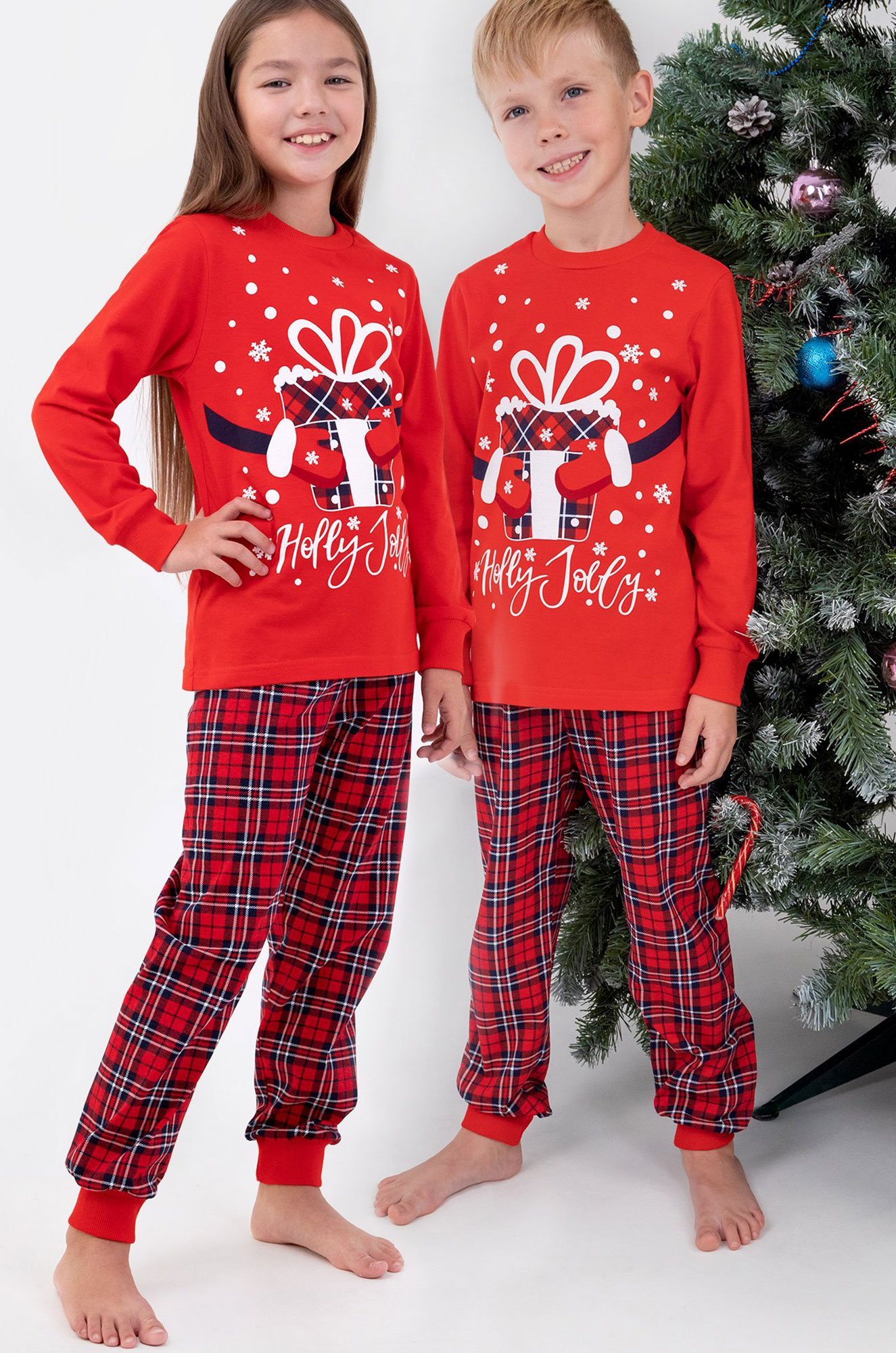 Детская пижама с брюками выполнена из натурального 100% хлопка. Свободный крой не сковывает движений и позволяет ребенку всегда оставаться активным, а яркий красный цвет и праздничный принт подарки создают уютную атмосферу и поднимают настроение. Пижамка для мальчиков и девочек станет отличным подарком на Новый год и Рождество.