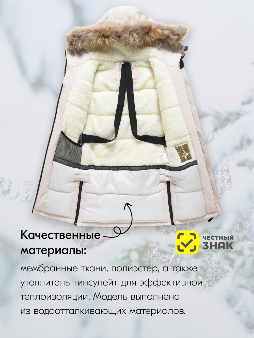 - Съемная меховая опушка: Из натурального меха, добавляет стильный акцент и дополнительное тепло.