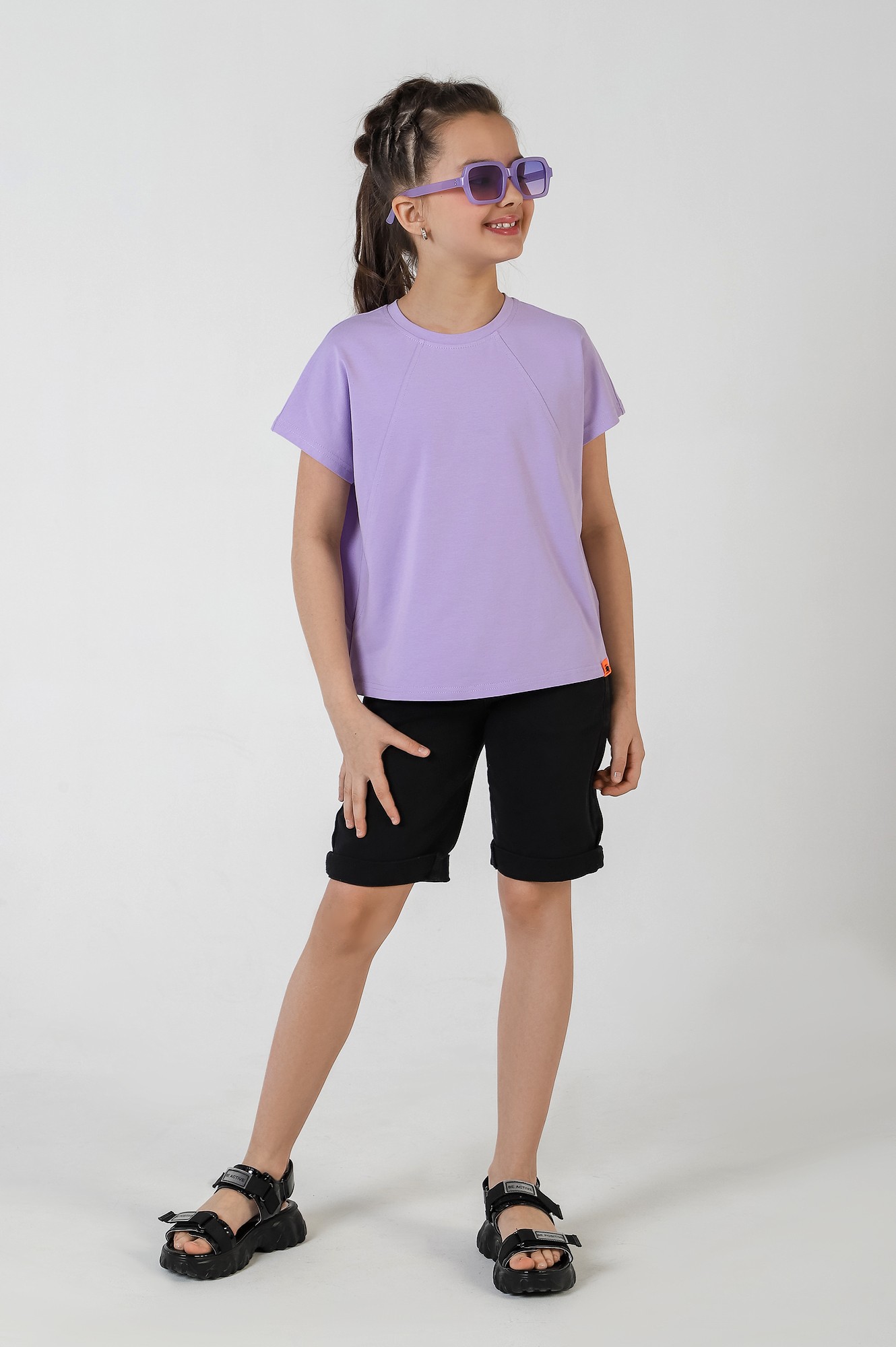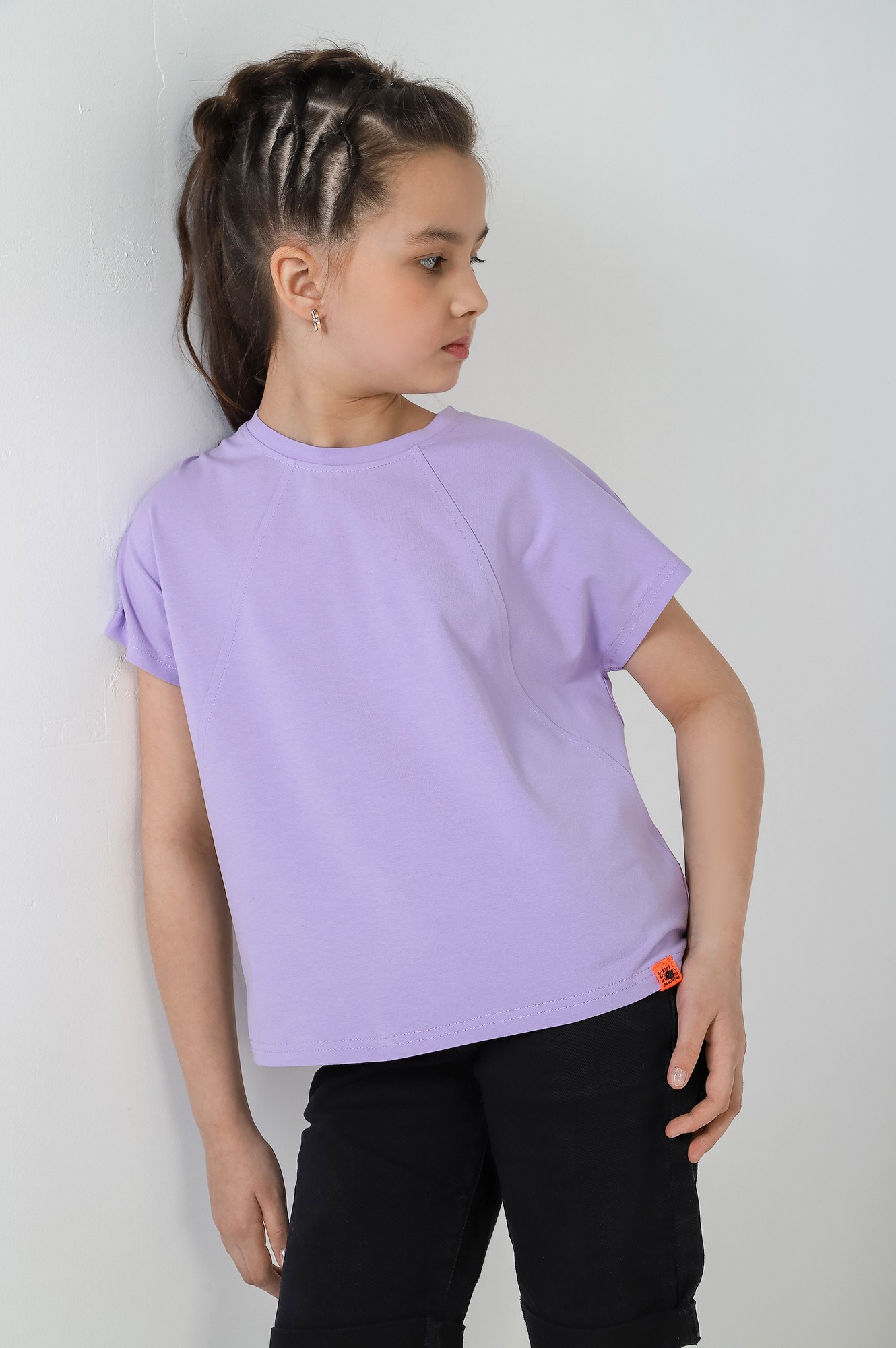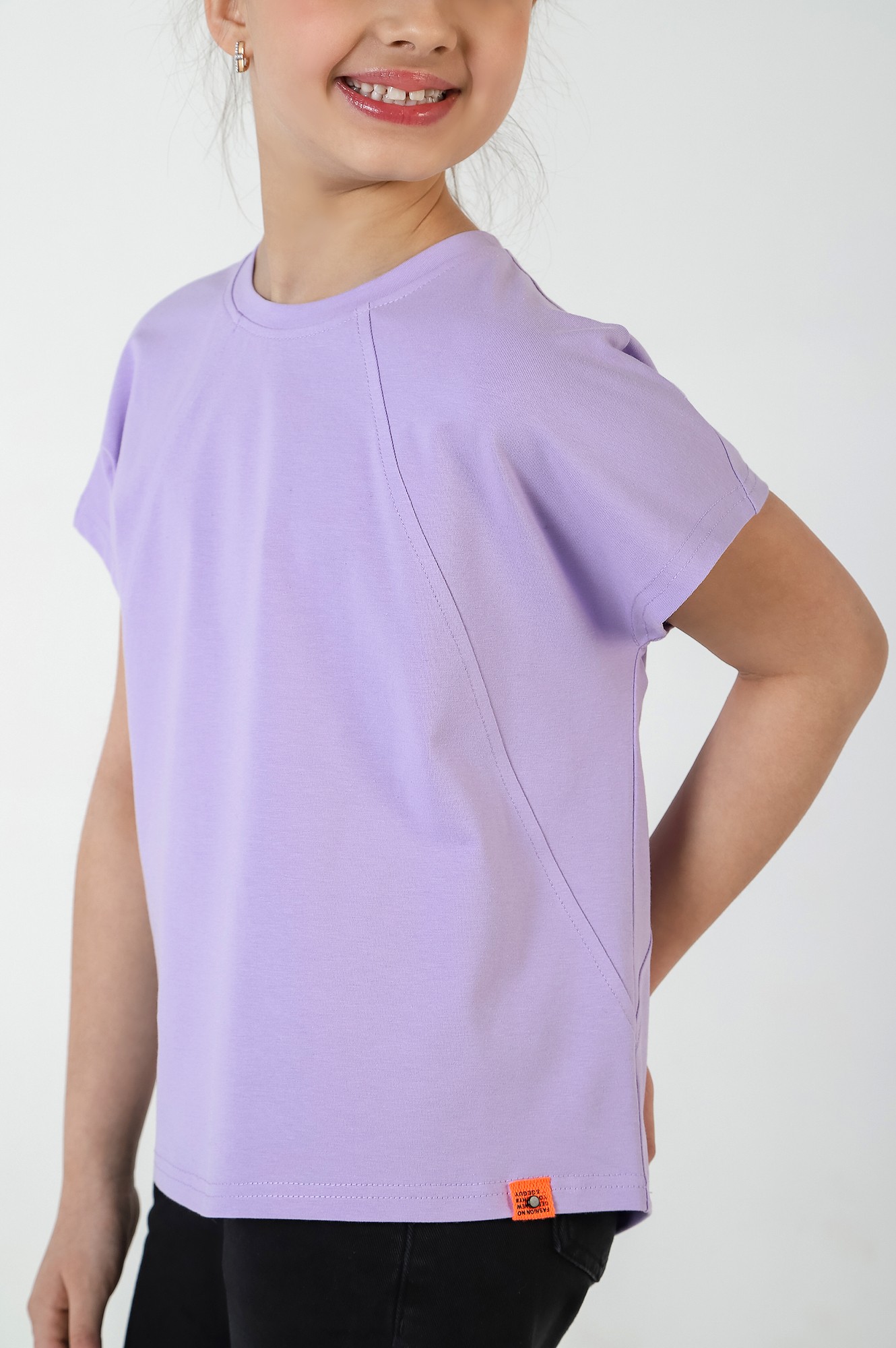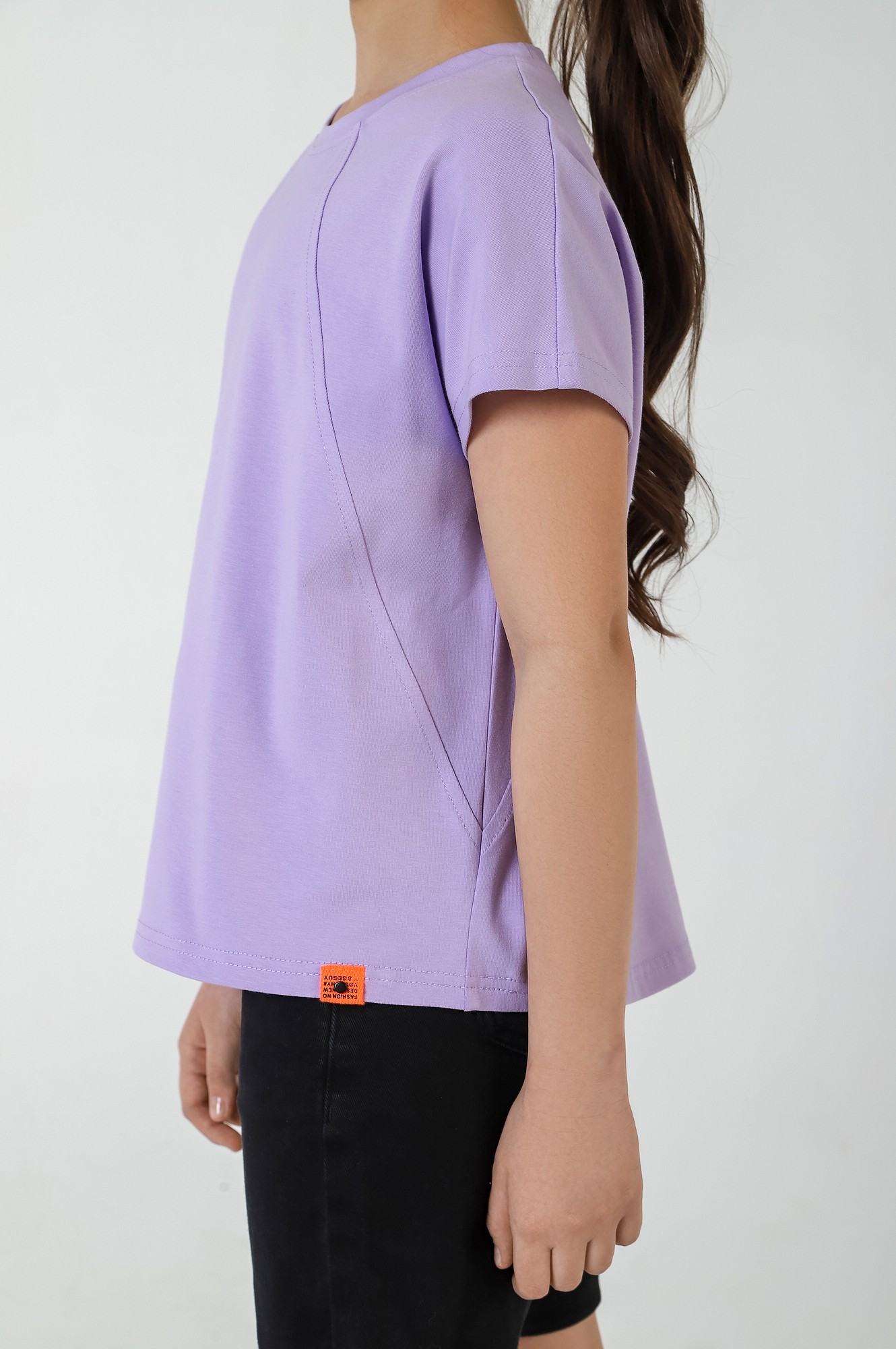 Футболка для девочки, модной объемно-силуэтной формы, свободная в верхней части. Модель с наклонными отстроченными швами по переду и спинке, фигурной линией низа (с небольшим удлинением сзади). Рукава короткие цельнокроенные.