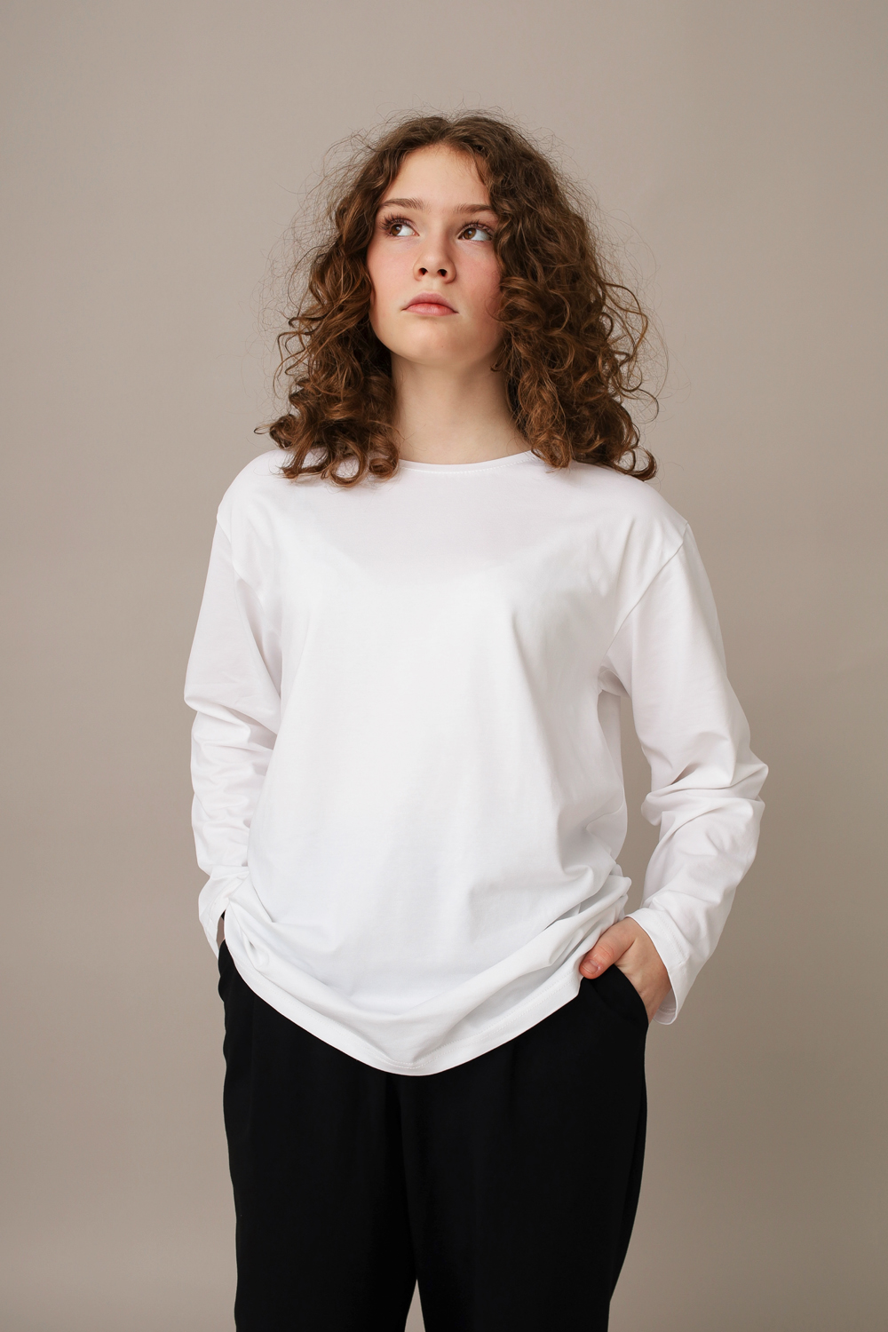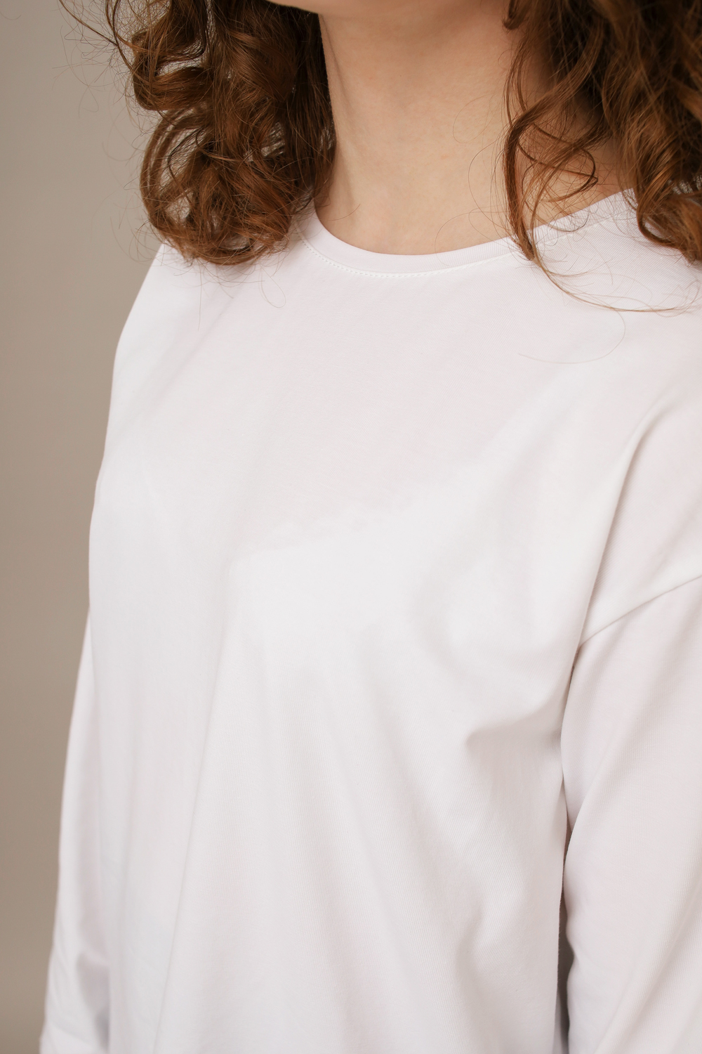 Лонгслив с круглым вырезом горловины. Свободный силуэт, спущенное плечо.