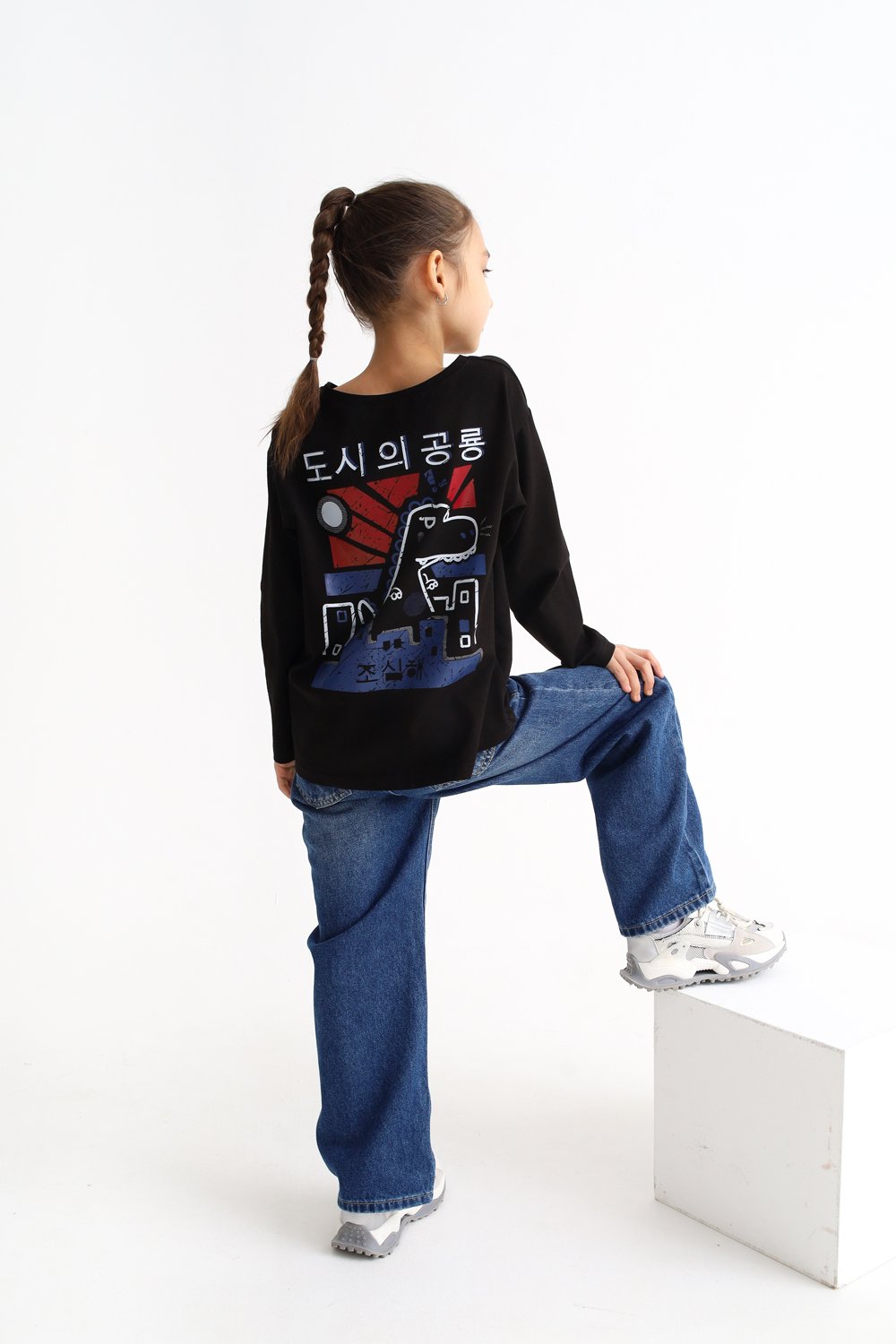 - яркий принт на корейском языке «Динозавр в городе»