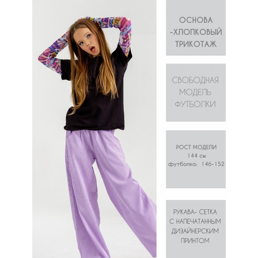 Футболка выполнена из хлопкового трикотажа (92% хлопок и 8% лайкра) высшего качества;  рукава- 100% полиэстер, выполнены из сетки с нанесенным принтом, очень нежные и приятные к телу.