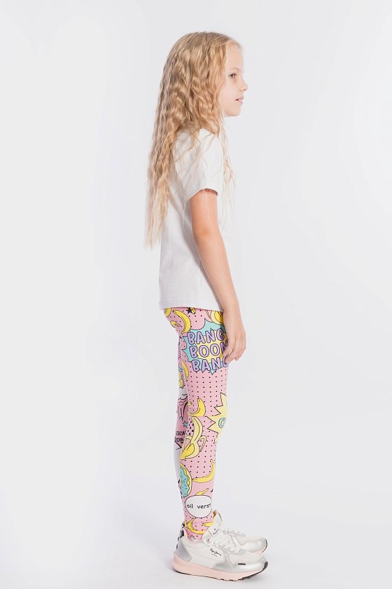 Лосины для девочки выполнены из хлопкового полотна с добавлением лайкры. Пояс на резинке.