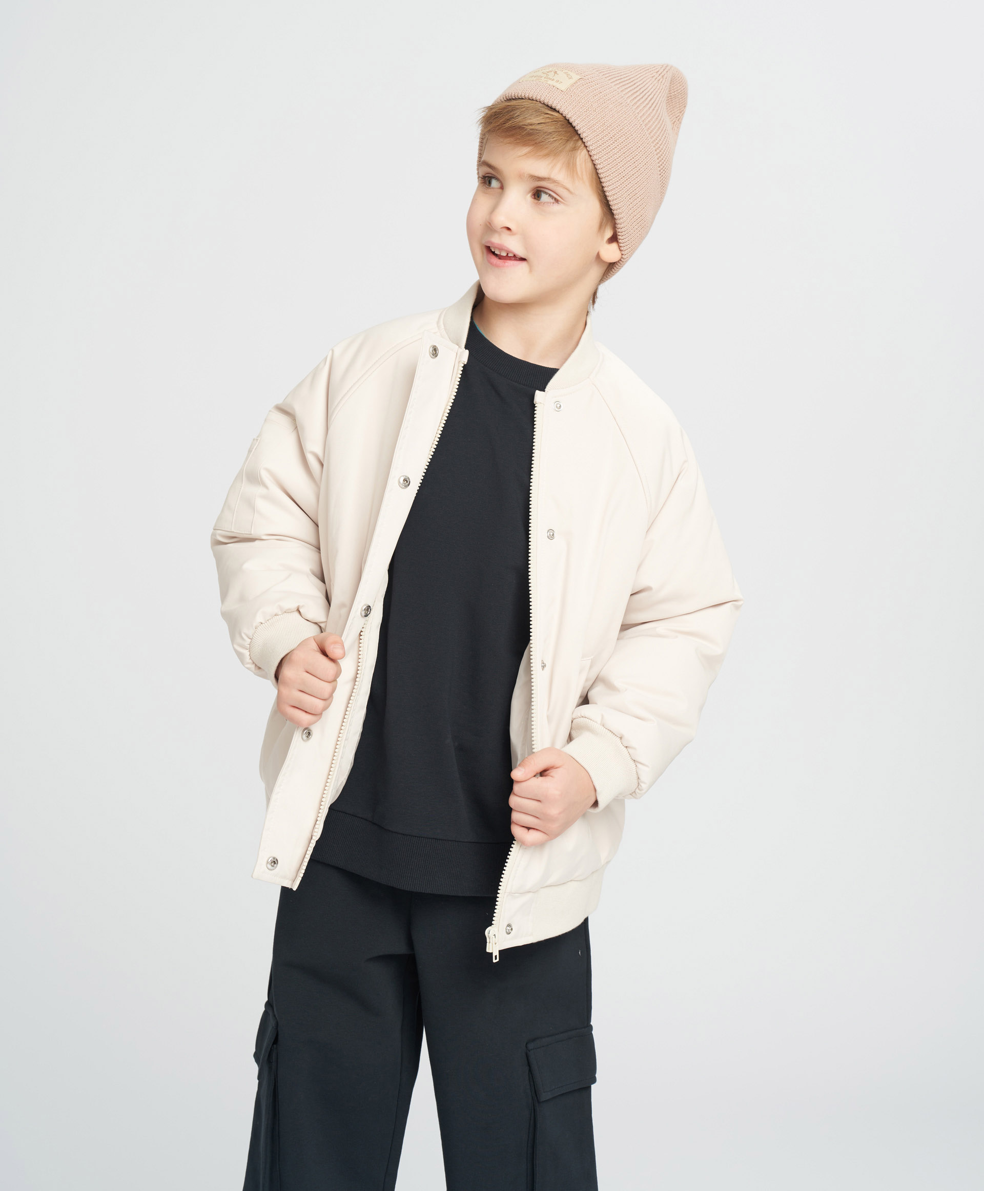 Белый бомбер из плащевки не промокает. С утеплителем синтепон 180 г/м2, текстильной подкладкой, эластичными рибовыми манжетами и низом куртки будет комфортно даже в +5°С. В бомбере на кнопках и молнии с защитой от защемления можно отправиться на прогулку, шопинг, в путешествие или на учебу. В четырех карманах можно греть руки и хранить мелочи. Посадка оверсайз, не прилегает. Под такую демисезонную куртку можно надеть одежду любой толщины – будет удобно и тепло. Для безопасности имеются светоотражающие элементы и адресник. Бомбер в оттенке белый оникс выглядит эффектно и дорого. К тому же он универсальный – подойдет мальчикам и девочкам.