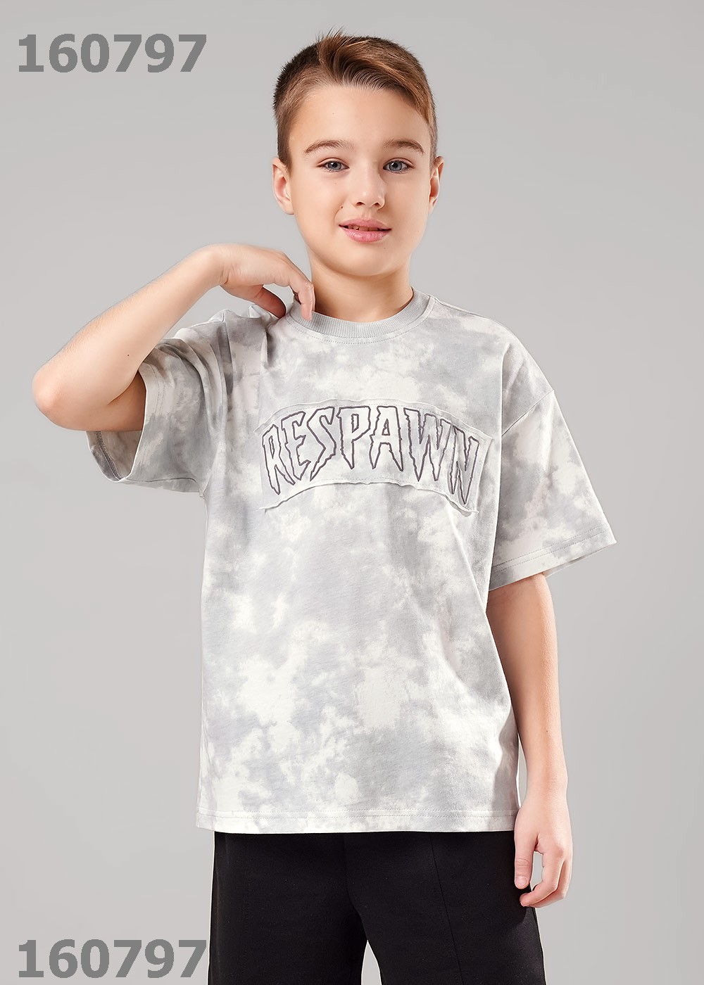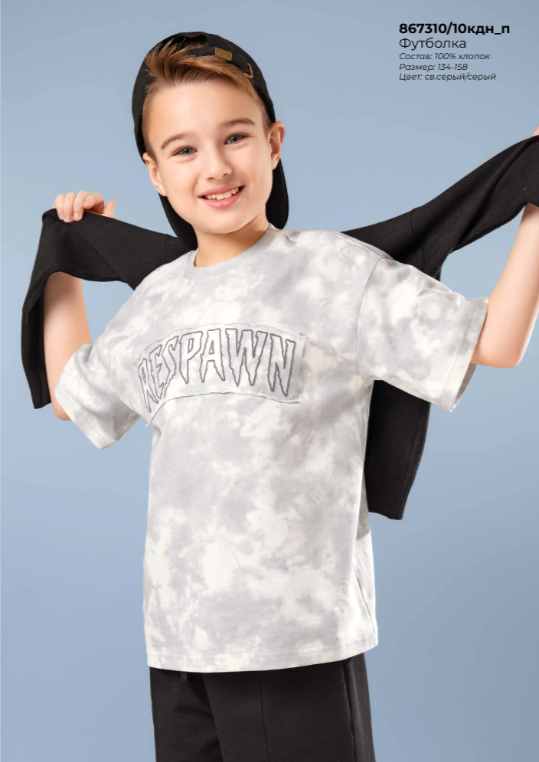 "Описание: Хлопковая оверсайз футболка с эффектом варки - основа любого гардероба. Эластичная горловина, комфортная посадка по фигуре, принт- аппликация спереди. Сочетай с брюками или шортами из новой коллекции и будь в тренде!