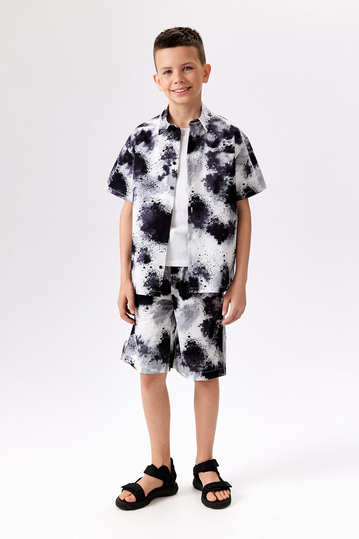 Детские шорты для мальчика изготовлены из легкой хлопковой ткани, которая обеспечивает комфорт во время прогулок в жаркую погоду. Пояс на резинке регулируется шнурком для идеальной посадки, добавляя удобство в ношении. Шорты длиной выше колена позволяют легко двигаться, что важно для активных мальчиков. Боковые карманы и карман на спинке обеспечивают удобство для хранения мелочей. Особенность изделия – дизайнерский принт в виде распыленной краски, что делает образ более запоминающимся и оригинальным, привлекая внимание к стилю юного модника. Стилизуйте шорты в чёрно-белом цвете с футболкой, чтобы создать модный повседневный образ на каждый день. (20110420123) Черно-белый