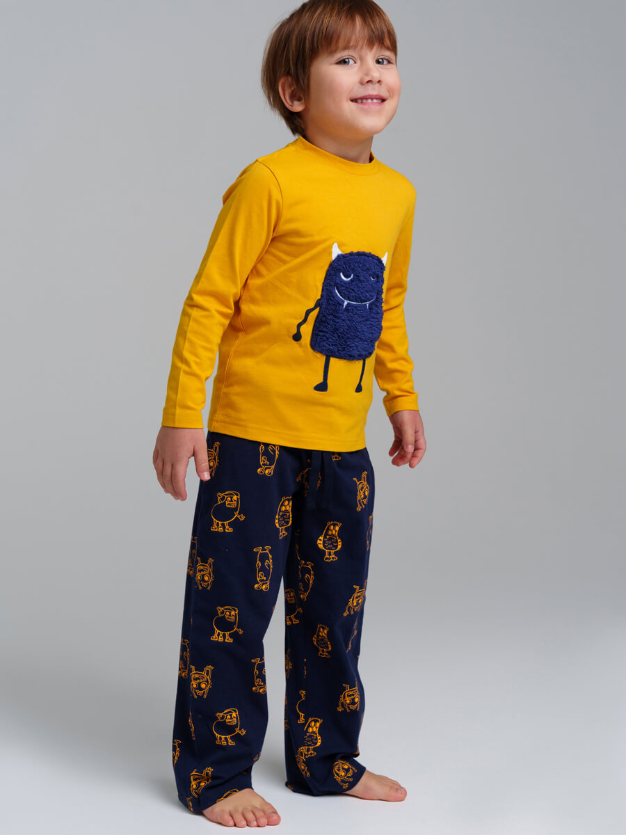 Пижама: лонгслив и брюки из эластичного и приятного на ощупь трикотажа. На брюках эластичный пояс со шнурком. Высокое содержание хлопка 95%. Благодаря наличию эластана в составе ткани изделие держит форму и меньше мнется. 95% хлопок, 5% эластан