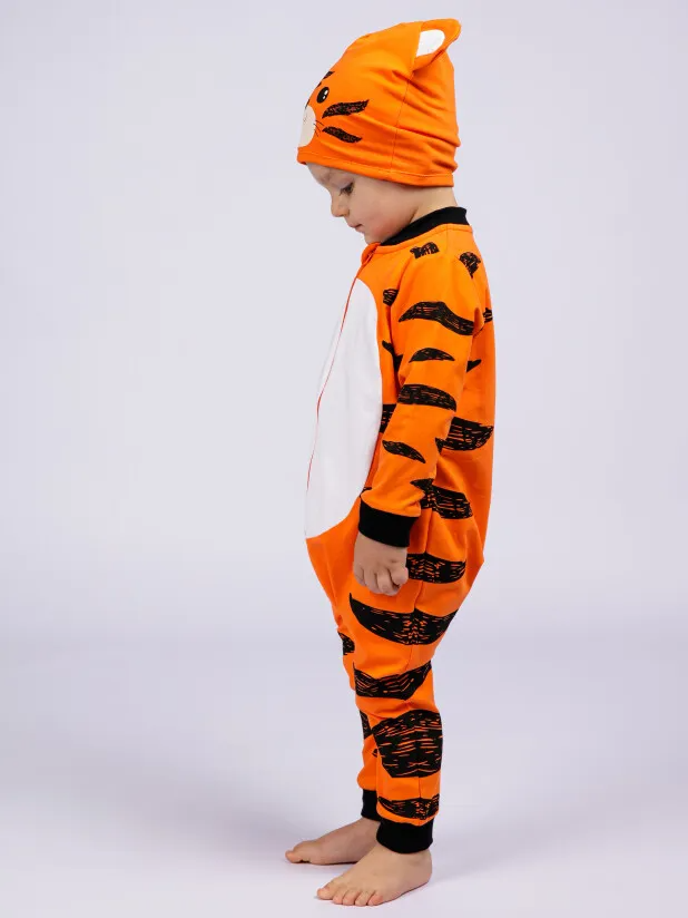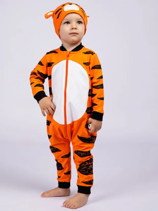 Комплект: комбинезон и шапочка из эластичного трикотажа. Высокое содержание хлопка 95%. Благодаря наличию эластана в составе ткани изделие проще в уходе и держит форму. Спереди застежка на молнию. Текстильный клапан для защиты подбородка, а также внутренняя защитная планка. Горловина, манжеты и нижняя кромка брючин в эластичный рубчик.