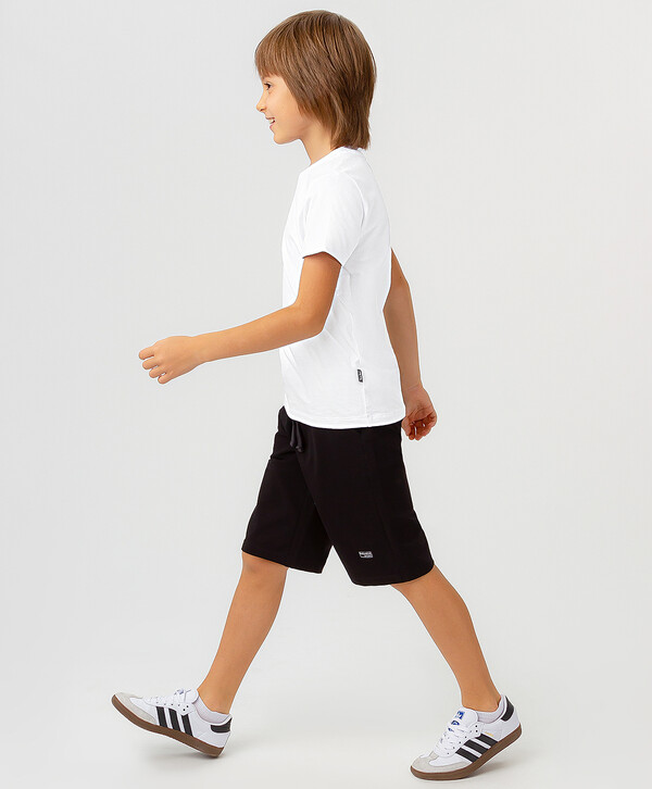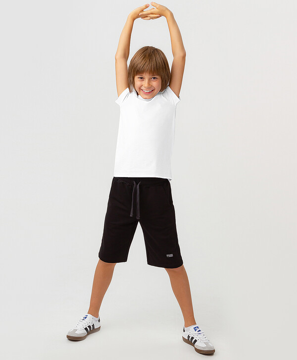 Трикотажные шорты черного цвета для мальчика с поясом на резинке. Благодаря встроенным в пояс функциональным завязкам можно корректировать посадку индивидуально по фигуре ребенка. Для удобства шорты оснащены двумя прорезными карманами. Мягкий смесовый трикотаж из хлопка, полиэстера и эластана обеспечивает качественный теплообмен и сохраняет форму изделия даже после длительной носки. Модель имеет гладкую лицевую сторону и петельчатую изнанку без начеса. Благодаря свободной посадке шорты оптимальны для занятий физкультурой, повседневных прогулок и мероприятий. Имитация ширинки и патч-нашивка на левой штанине спереди добавляют стильный акцент в общий дизайн модели. В школьной или другой капсульной коллекции Баттон Блю можно подобрать к однотонным шортам идеальный верх для эффектных спортивных образов.