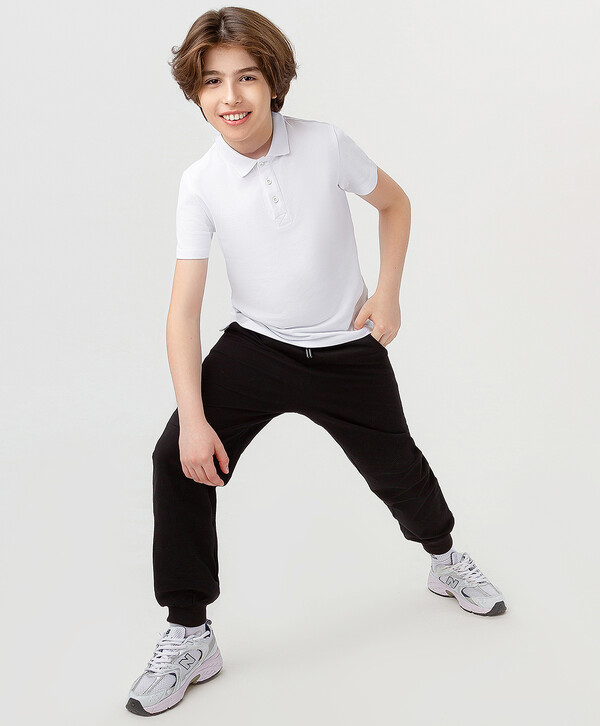 Трикотажные брюки черного цвета для мальчика с поясом на резинке. Благодаря встроенным в пояс функциональным завязкам можно корректировать посадку индивидуально по фигуре ребенка. Для удобства брюки оснащены двумя прорезными карманами. Мягкий смесовый трикотаж из хлопка и полиэстера обеспечивает качественный теплообмен и сохраняет форму изделия даже после длительной носки. Модель имеет гладкую лицевую сторону и петельчатую изнанку без начеса. Свободные штанины заужены к низу и оснащены эластичными манжетами, которые будут мягко прилегать к телу. Благодаря свободной посадке брюки оптимальны для занятий физкультурой, гимнастикой, повседневных прогулок и мероприятий. Модель украшена стильными акцентами - прошитой перпендикулярной строчкой на штанинах спереди и патчем-нашивкой с логотипом сзади. В школьной или другой капсульной коллекции Баттон Блю можно подобрать к брюкам идеальный верх для эффектных образов.