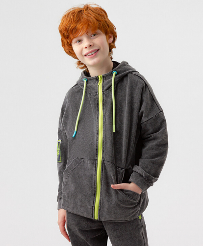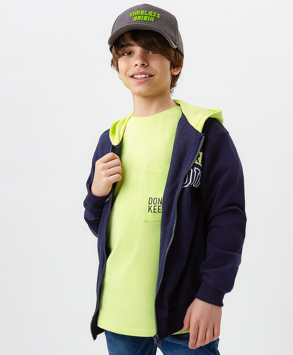 800 р. 1600 р. Толстовка из футера на молнии с принтом и контрастным капюшоном темно-синяя для мальчика Button Blue